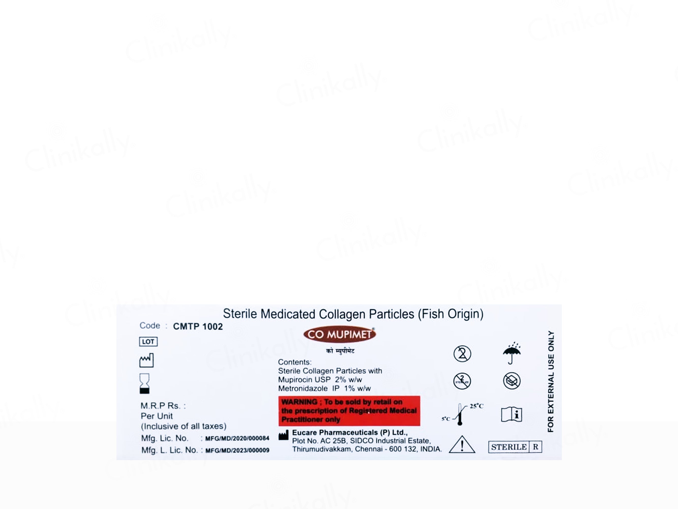 CO Mupimet is a sterile medicated wound healing preparation containing Collagen Particles (fish origin) enriched with Mupirocin (2% w/w) and Metronidazole (1% w/w). It is used for effective wound management, infection control, and faster tissue regeneration. The collagen promotes healing by acting as a scaffold for new tissue, while mupirocin and metronidazole prevent bacterial and anaerobic infections.
