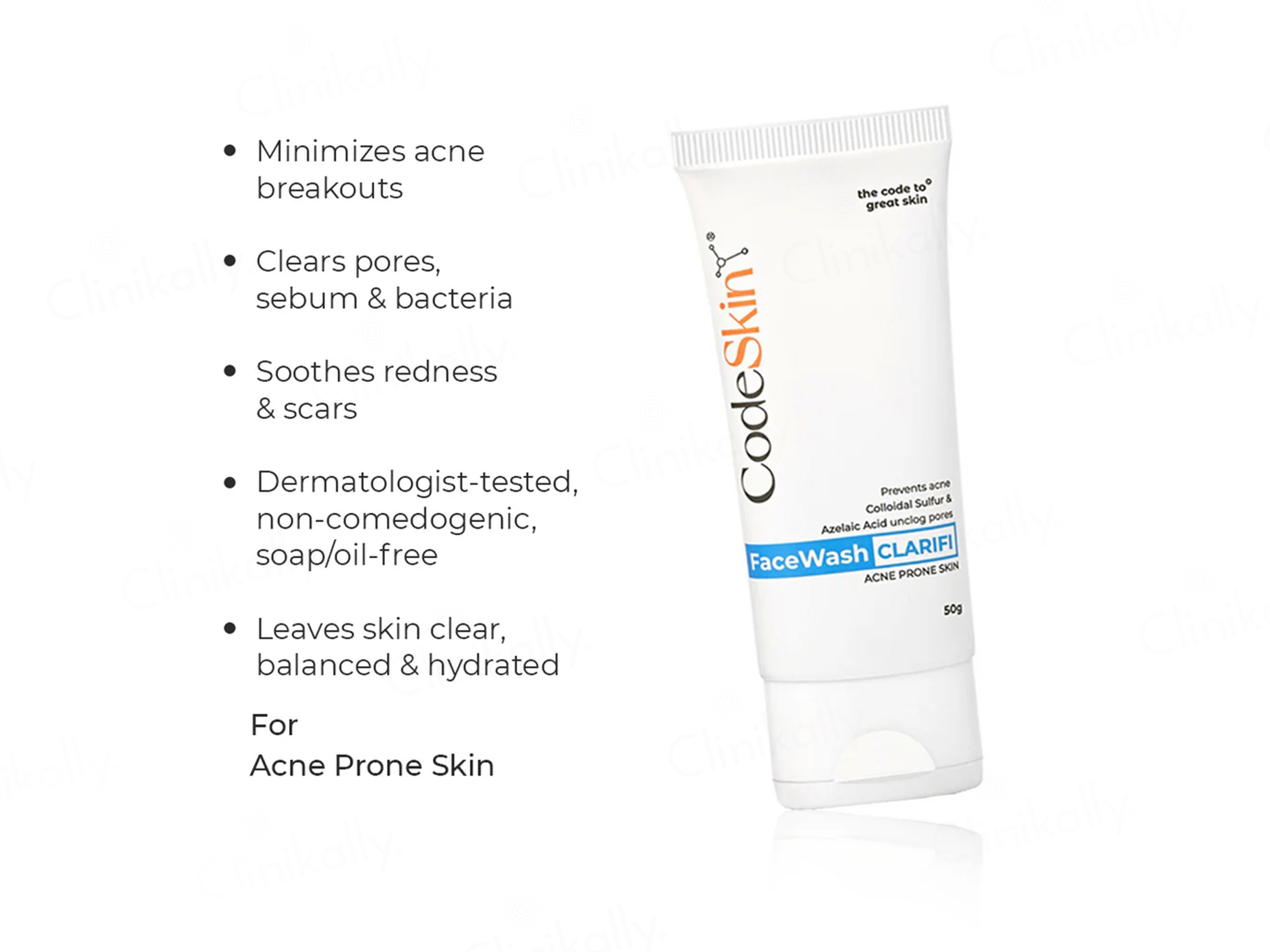 CodeSkin Clarifi Face Wash is a cleanser for acne-prone skin to prevent breakouts and unclog pores.