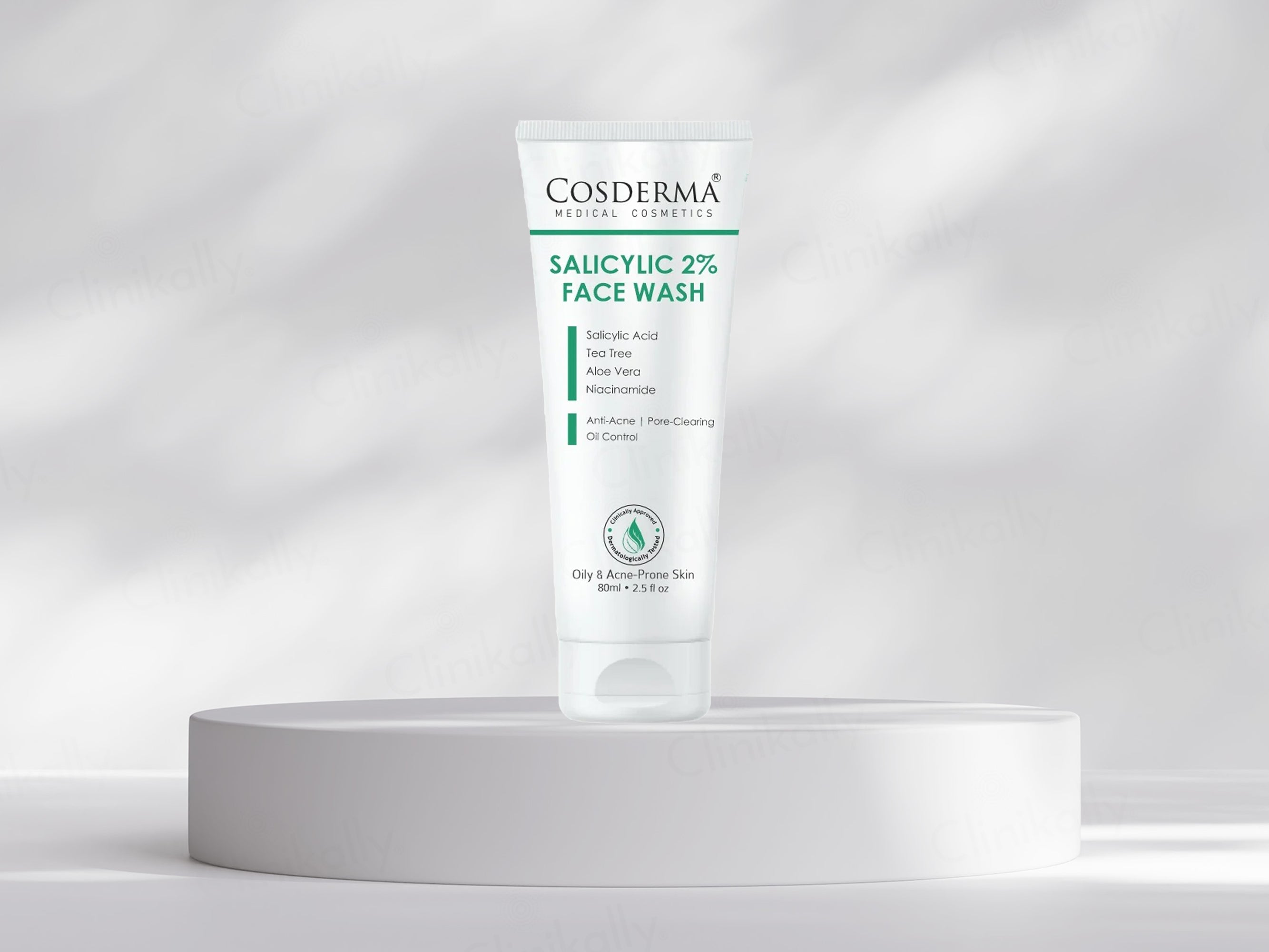Cosderma Salicylic 2% Face Wash is a dermatologist-tested foaming cleanser formulated to combat acne, control oil, and deeply cleanse pores. Powered with 2% Salicylic Acid, Tea Tree Extract, Aloe Vera, and Niacinamide, it effectively unclogs pores, removes impurities, and reduces blackheads and whiteheads while soothing redness and inflammation. This gentle yet potent formulation helps minimize acne marks and blemishes, maintaining clear, balanced, and refreshed skin without over-drying. Ideal for oily, acne-prone, and combination skin, it is paraben-free, sulphate-free, cruelty-free, and suitable for daily use to prevent future breakouts and promote an even, healthy complexion.