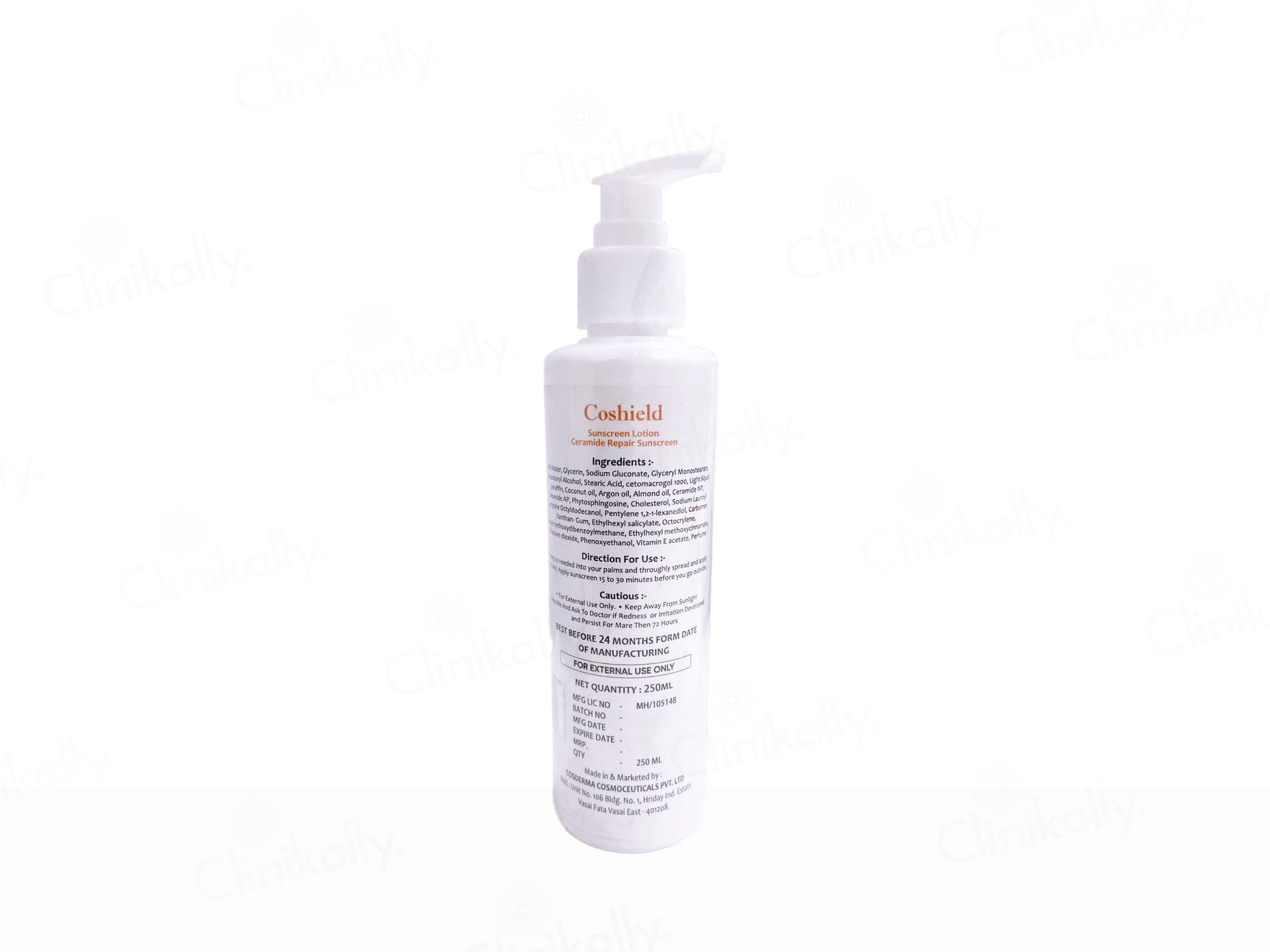 Cosderma Coshield Ceramide Repair Sunscreen Lotion SPF 50 is a broad-spectrum sunscreen lotion enriched with ceramides to protect and repair the skin barrier while shielding it from harmful UVA and UVB rays. Its advanced sun protection formula hydrates and strengthens sensitive or damaged skin, reducing redness and irritation. Lightweight and non-greasy, this sunscreen lotion absorbs quickly without leaving a white cast, making it suitable for all skin types. Ideal for daily use, it offers long-lasting protection with restorative benefits and a balanced skin pH.