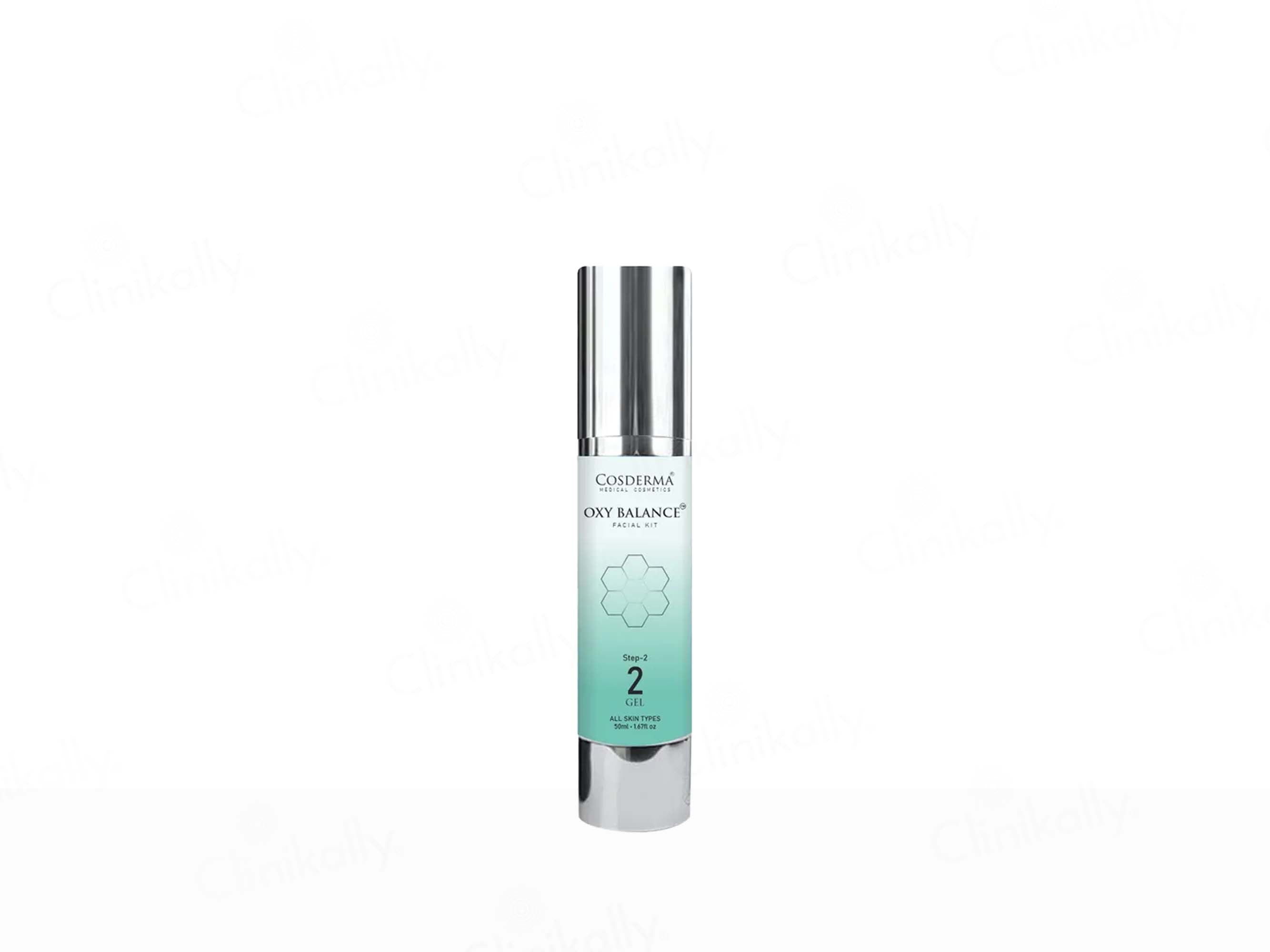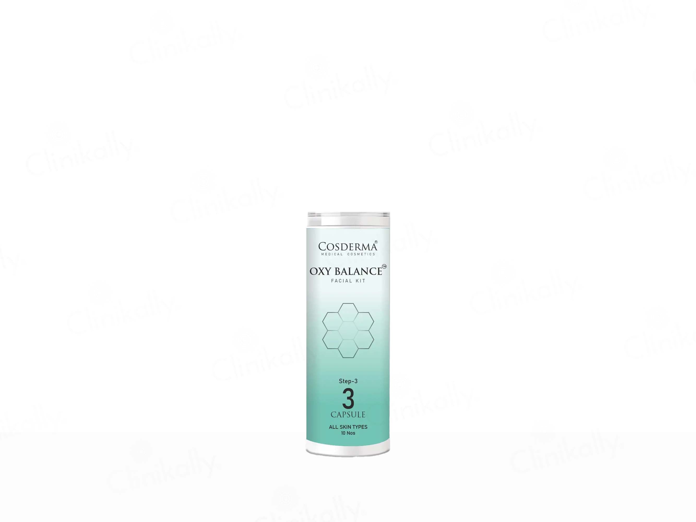 Cosderma Oxy Balance Facial Kit is a skincare set that helps cleanse, hydrate, and balance the skin with four products: cleanser, capsule, gel, and serum.