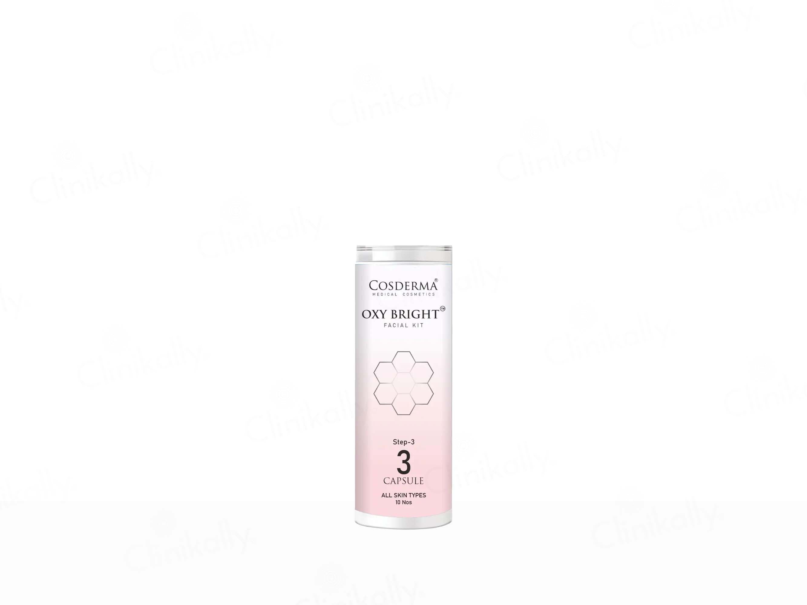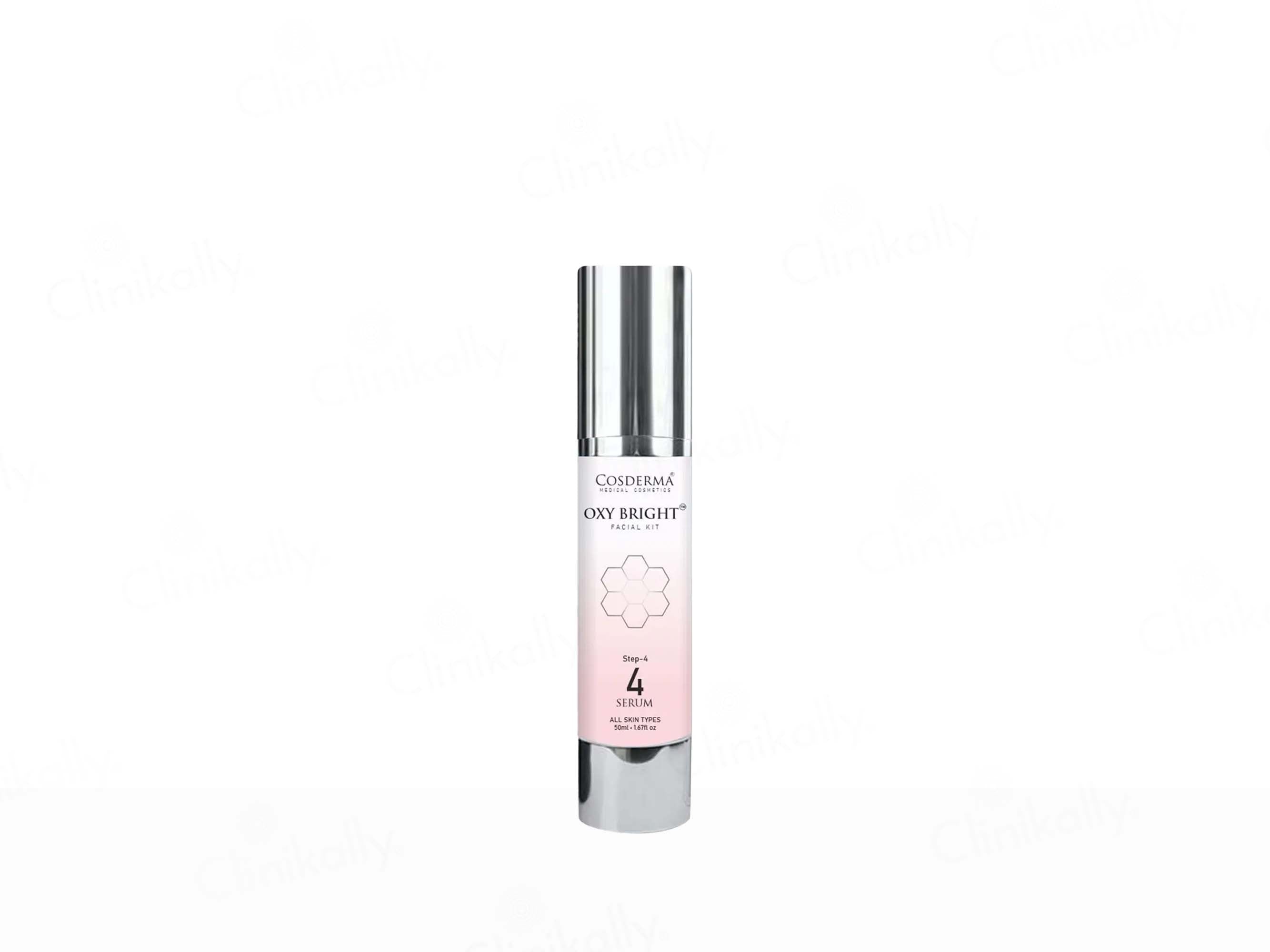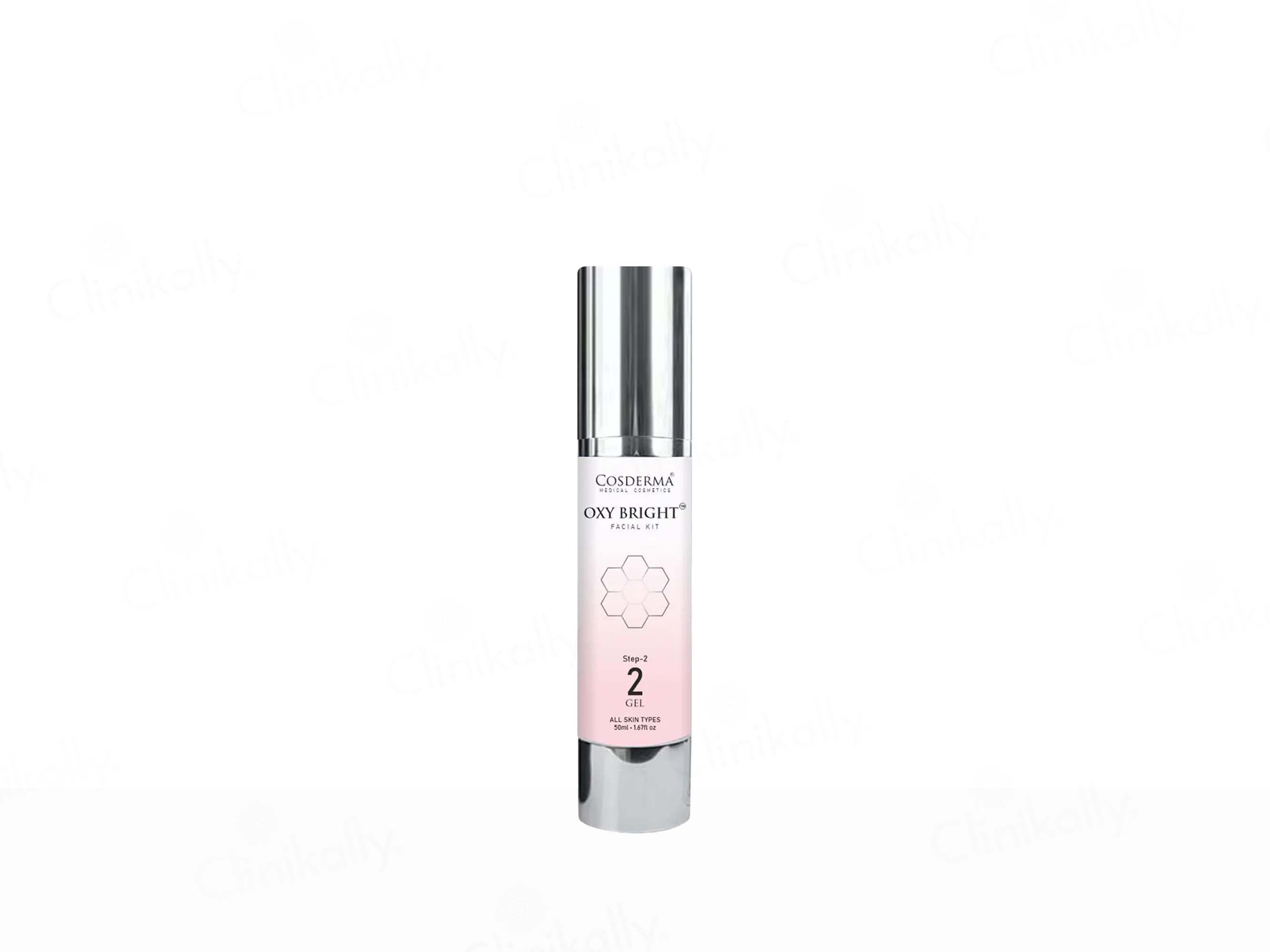Cosderma Oxy Bright Facial Kit is designed to help brighten, cleanse, and rejuvenate the skin. The kit features four products: Oxy Bright Cleanser, Oxy Bright Capsule, Oxy Bright Gel, and Oxy Bright Serum. The Oxy Bright Cleanser contains key ingredients such as Sodium Gluconate, Lactic Acid, and Vitamin E to effectively cleanse and exfoliate the skin, leaving it smooth and refreshed. The Oxy Bright Capsule, with Sodium Bicarbonate, Niacinamide, and Ascorbic Acid, helps in skin nourishment and brightening. The Oxy Bright Gel, enriched with Aloe Vera Extract and Glycerin, works to hydrate and soothe the skin while providing essential moisture. The Oxy Bright Serum, featuring Vitamin C, Niacinamide, and Aloe Vera Extract, is packed with brightening and rejuvenating properties, giving the skin a healthy, radiant glow. This kit is ideal for those looking to improve skin tone, texture, and brightness using potent active ingredients.