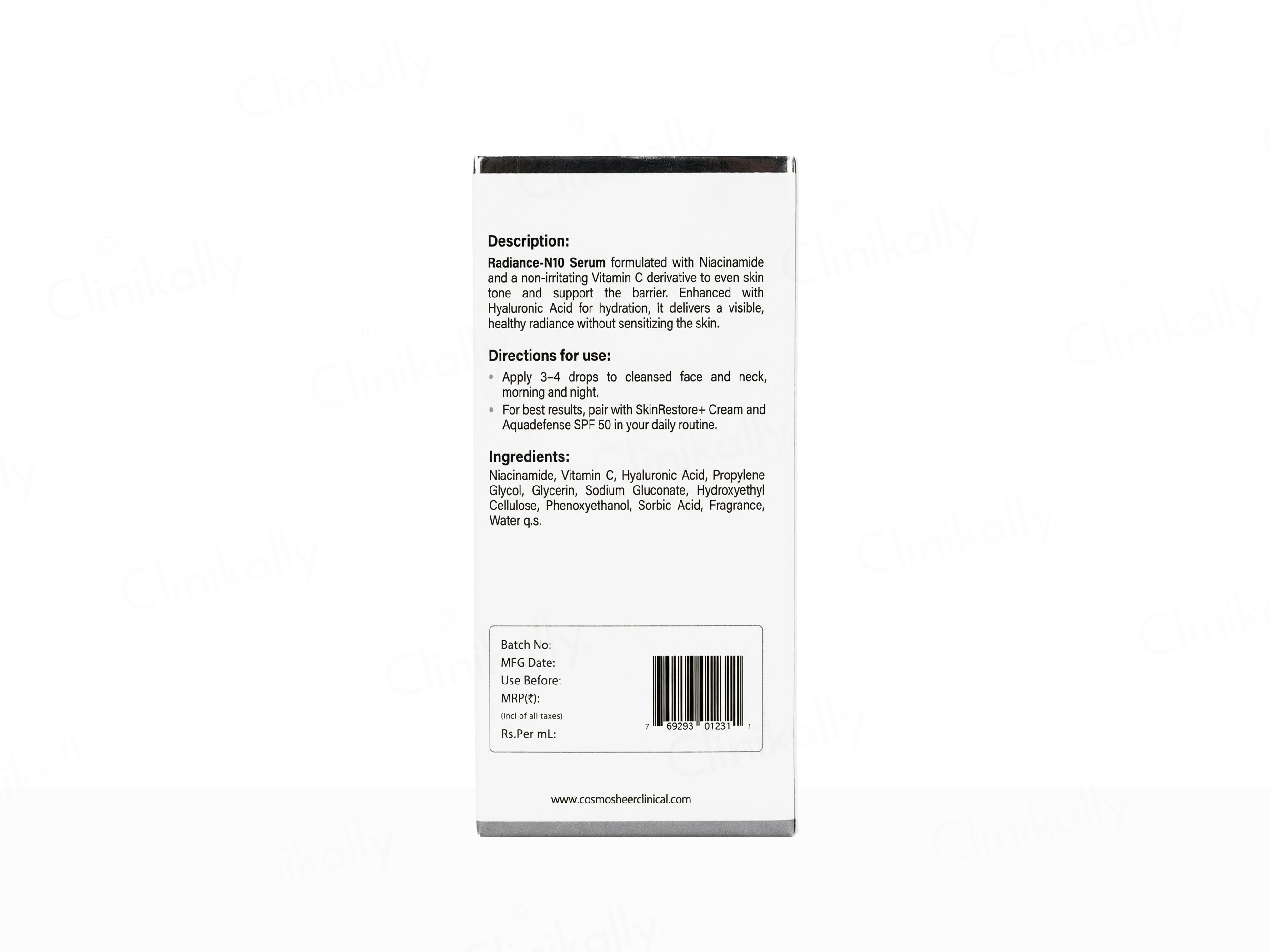 - Apply 3–4 drops of Cosmosheer Clinical Radiance-N10 Serum to cleansed face and neck morning and night.