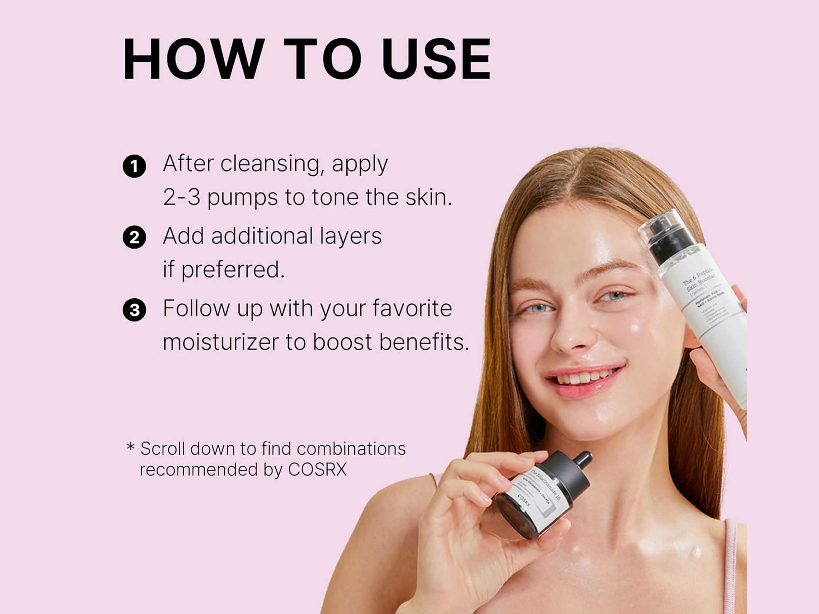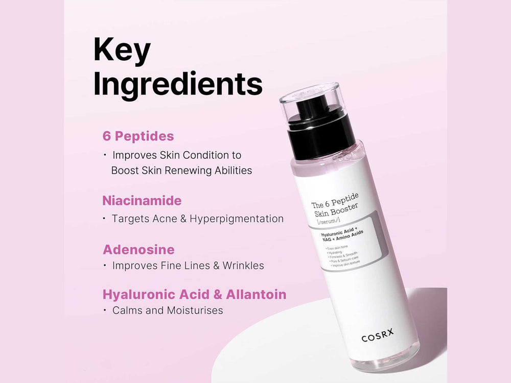 COSRX The 6 Peptide Skin Booster Serum is a multi-functional prepping toner-serum that supercharges your entire skincare routine. A cocktail of 6 peptides, niacinamide and adenosine helps smooth fine lines, improve elasticity and fade acne marks and hyperpigmentation. Hyaluronic acid, NAG, amino acids and allantoin deliver deep hydration while calming sensitivity and refining pores and excess sebum. The lightweight, water-like texture absorbs instantly, leaving skin soft, bouncy and radiant. Ideal for all skin types seeking firmer, glass-skin clarity and glow.