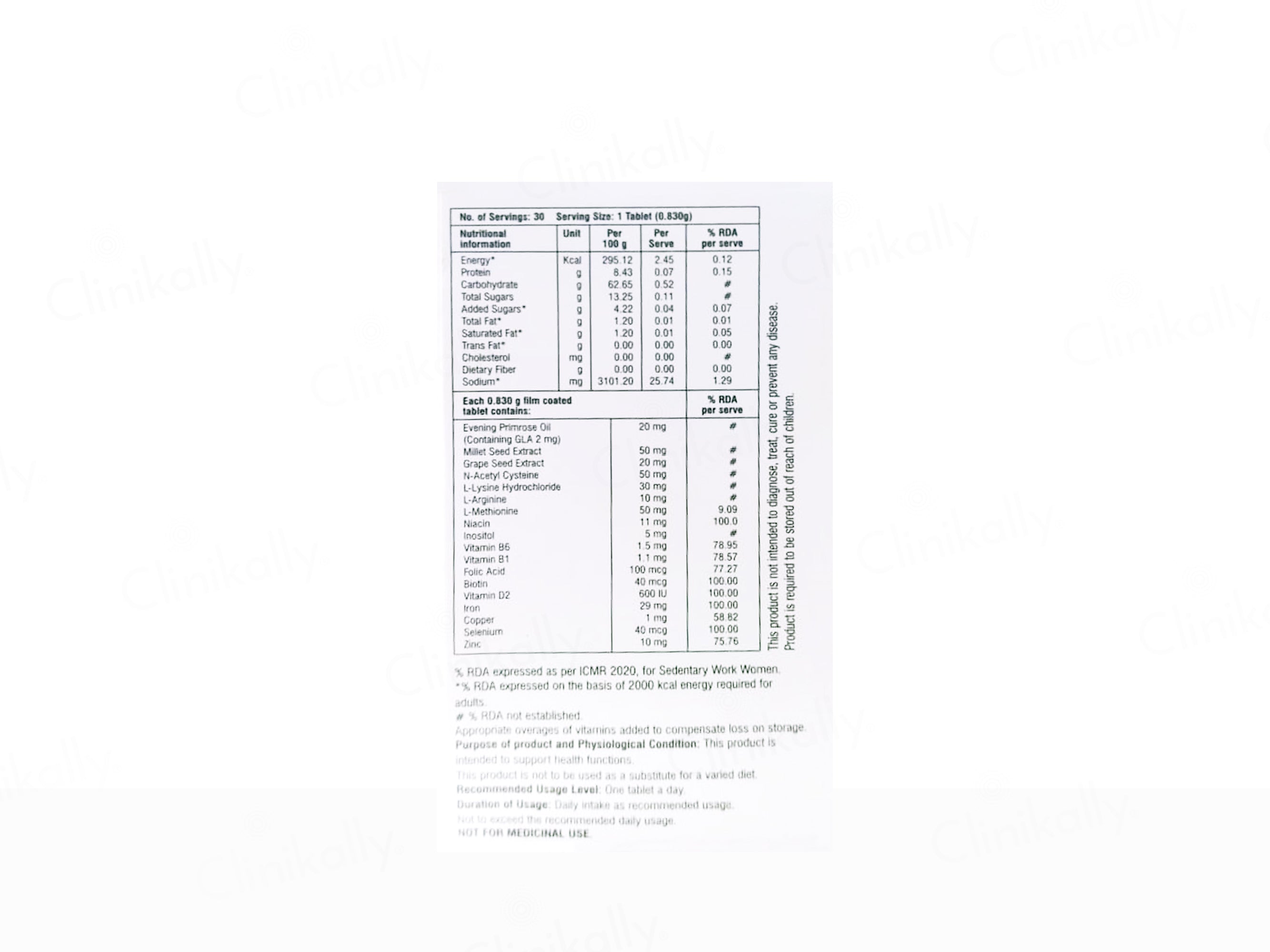 Cutihance Women Nutraceutical Tablet is a supplement that enhances skin, hair, and nail health with Evening Primrose Oil and Multivitamins.