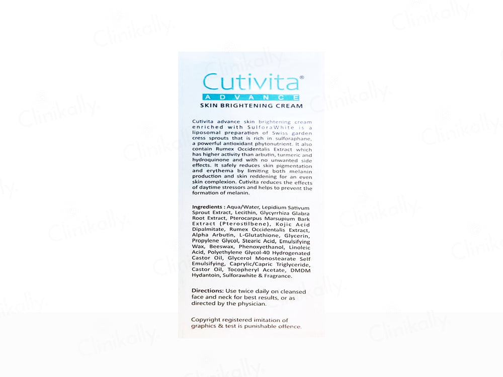 Cutivita Advance Skin Brightening Cream is a scientifically advanced formula enriched with SulforaWhite, a liposomal preparation of Swiss garden cress sprouts, rich in sulforaphane, a powerful antioxidant. This cream effectively reduces skin pigmentation and prevents melanin overproduction for a visibly brighter complexion. Infused with potent ingredients like Kojic Acid, L-Glutathione, and Alpha Arbutin, it helps fade dark spots and age-related discoloration. With a pH of 5.5, it maintains skin health while reducing redness. Free from parabens and colorants, Cutivita Advance Skin Brightening Cream ensures safe and long-lasting skin radiance.