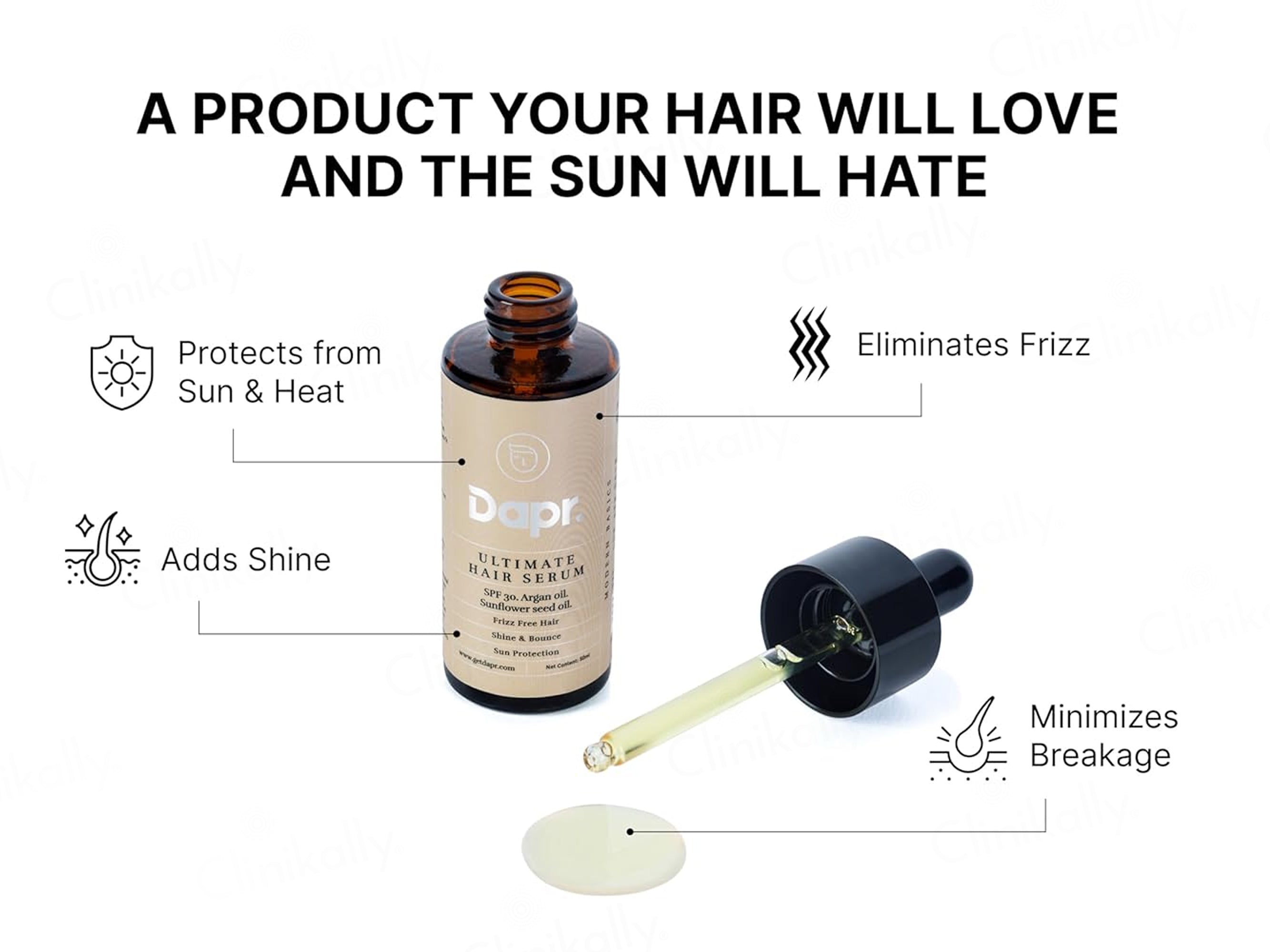 Dapr. Argan Oil & Sunflower Seed Oil Ultimate Hair Serum SPF 30 is a revolutionary hair care product designed to protect, nourish, and enhance your hair. Formulated with SPF 30 and enriched with argan oil, this serum shields hair from the sun's harmful rays while providing deep hydration and frizz control, making it the ultimate solution for everyday hair protection and care.