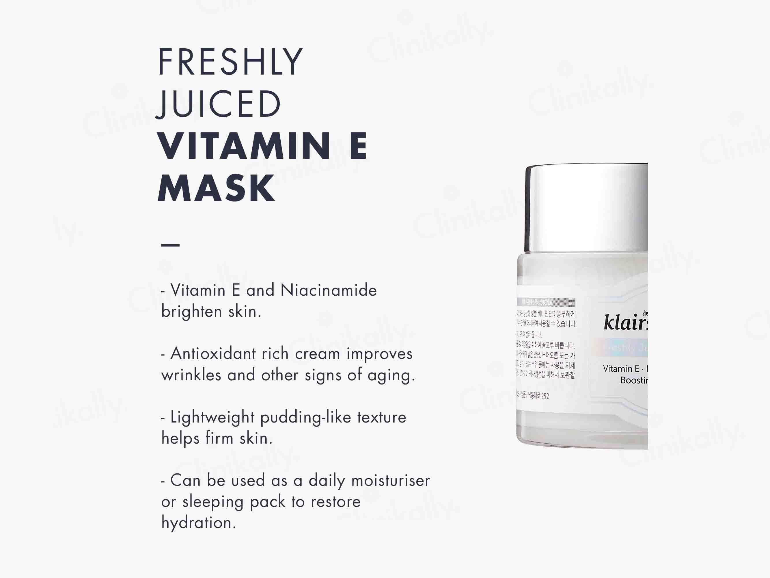 Klairs Freshly Juiced Vitamin E Mask is a versatile skincare product that offers multiple benefits. It can be used as a mask, moisturizer, or sleeping pack to nourish and rejuvenate your skin. Enriched with vitamin E, niacinamide, and adenosine, it provides antioxidant protection, brightens skin tone, and reduces the appearance of fine lines. Its unique pudding-like texture melts into the skin, delivering deep hydration and a healthy glow. Ideal for all skin types, this mask enhances your skincare routine for a radiant complexion.