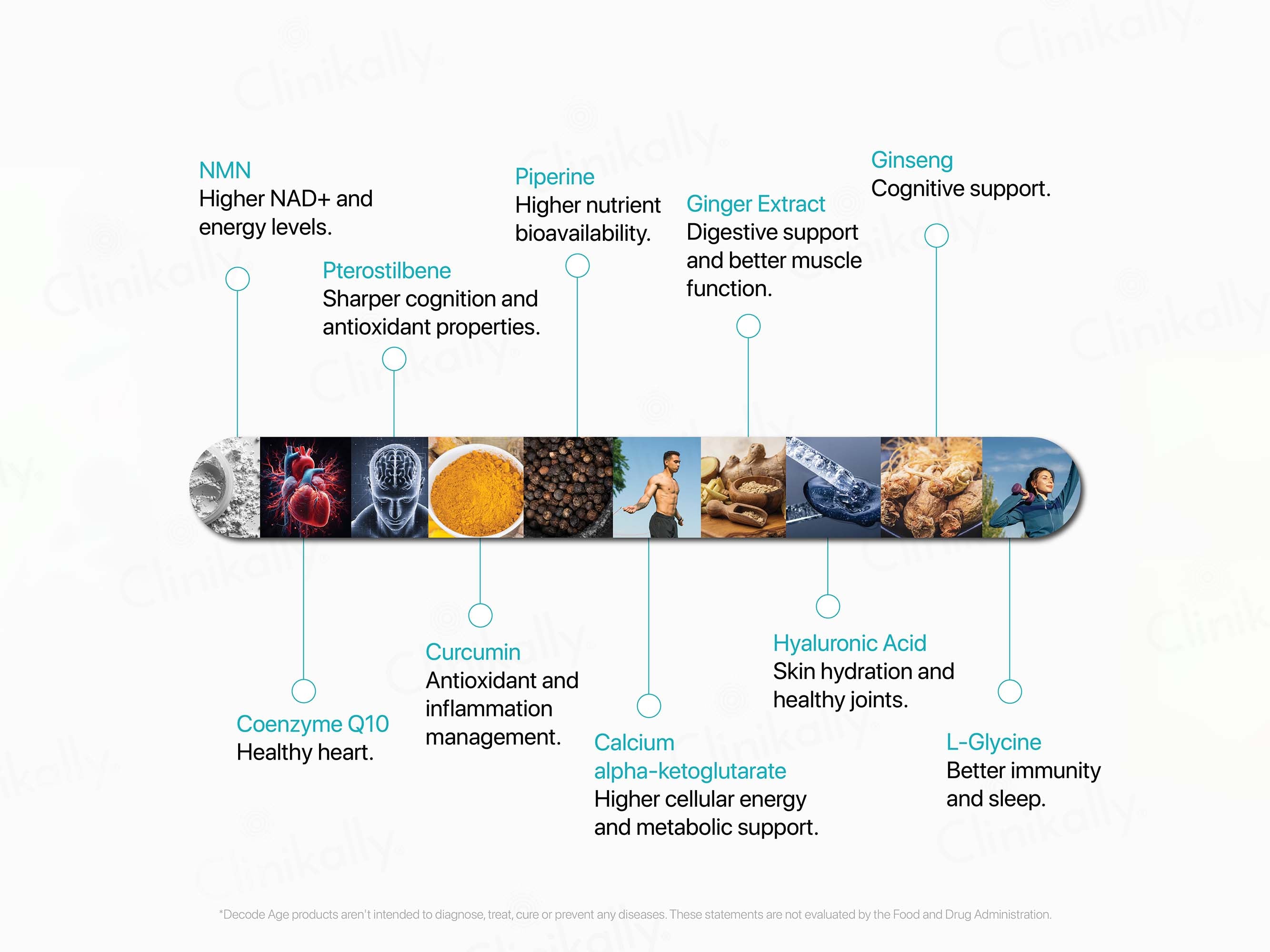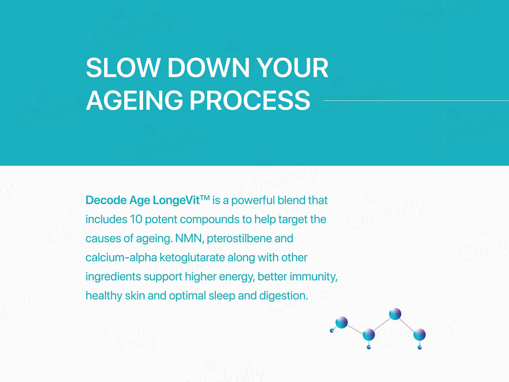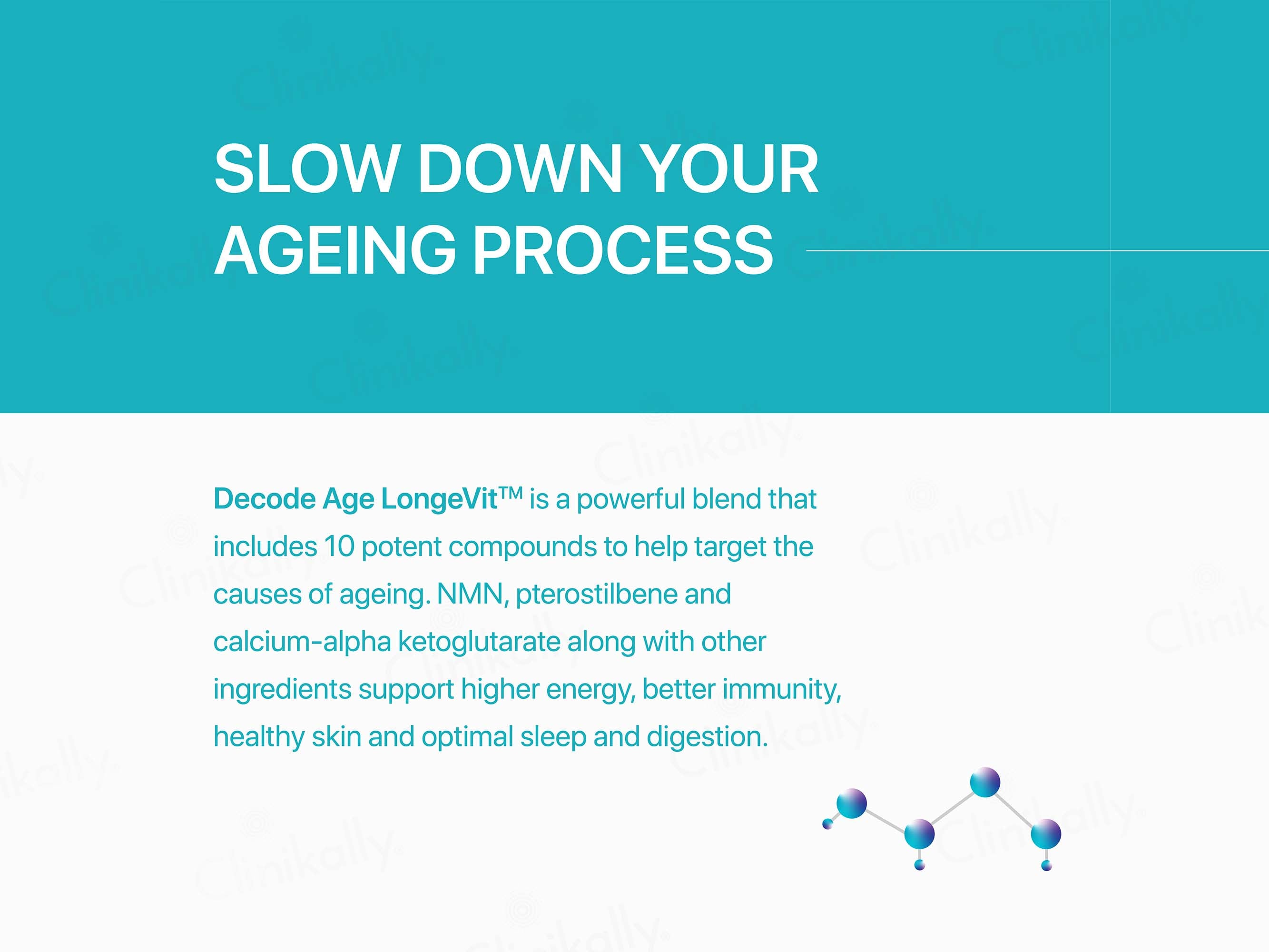 Decode Age LongeVit Vegan Tablet is a powerful supplement designed to enhance longevity and promote overall health. It contains key ingredients like β-Nicotinamide Mononucleotide (200mg), CoQ10 (100mg), Pterostilbene (50mg), Curcumin (75mg), Piperine (25mg), L-Glycine (100mg), Hyaluronic Acid (100mg), Ginger Extract (100mg), Ginseng (100mg), and Ca-AKG (80mg). These ingredients work synergistically to support healthy aging, improve metabolism, boost cognitive function, and provide antioxidant protection. It’s vegan, sugar-free, soy-free, and gluten-free.