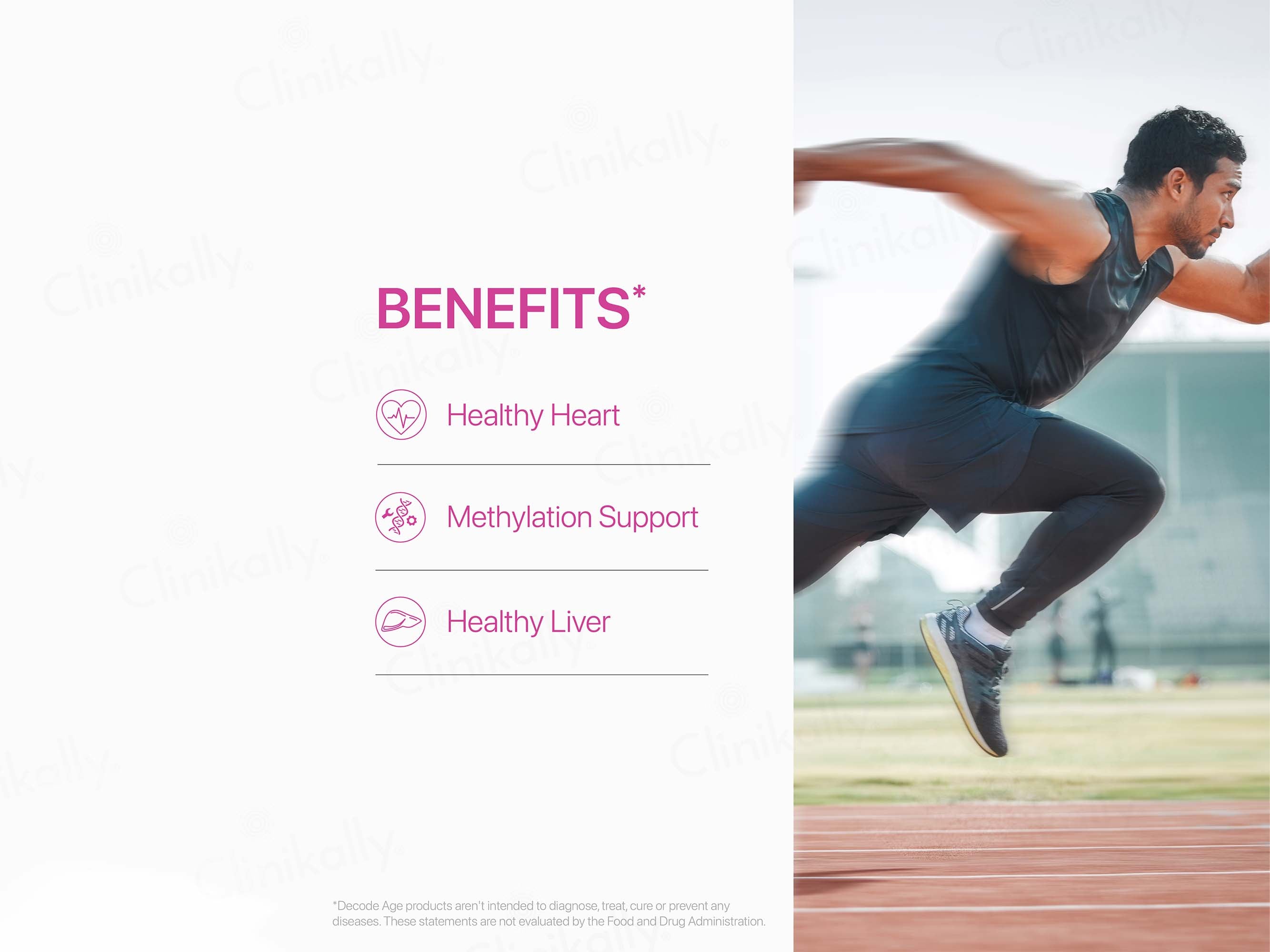 Decode Age TMG Vegan Capsules contain trimethylglycine (TMG) which is a key compound that supports the methylation processes. This results in helping optimize NAD+ levels and DNA production. It plays a pivotal role in maintaining cardiovascular health and boosting liver health, thereby making it a great supplement for overall well-being and vitality.