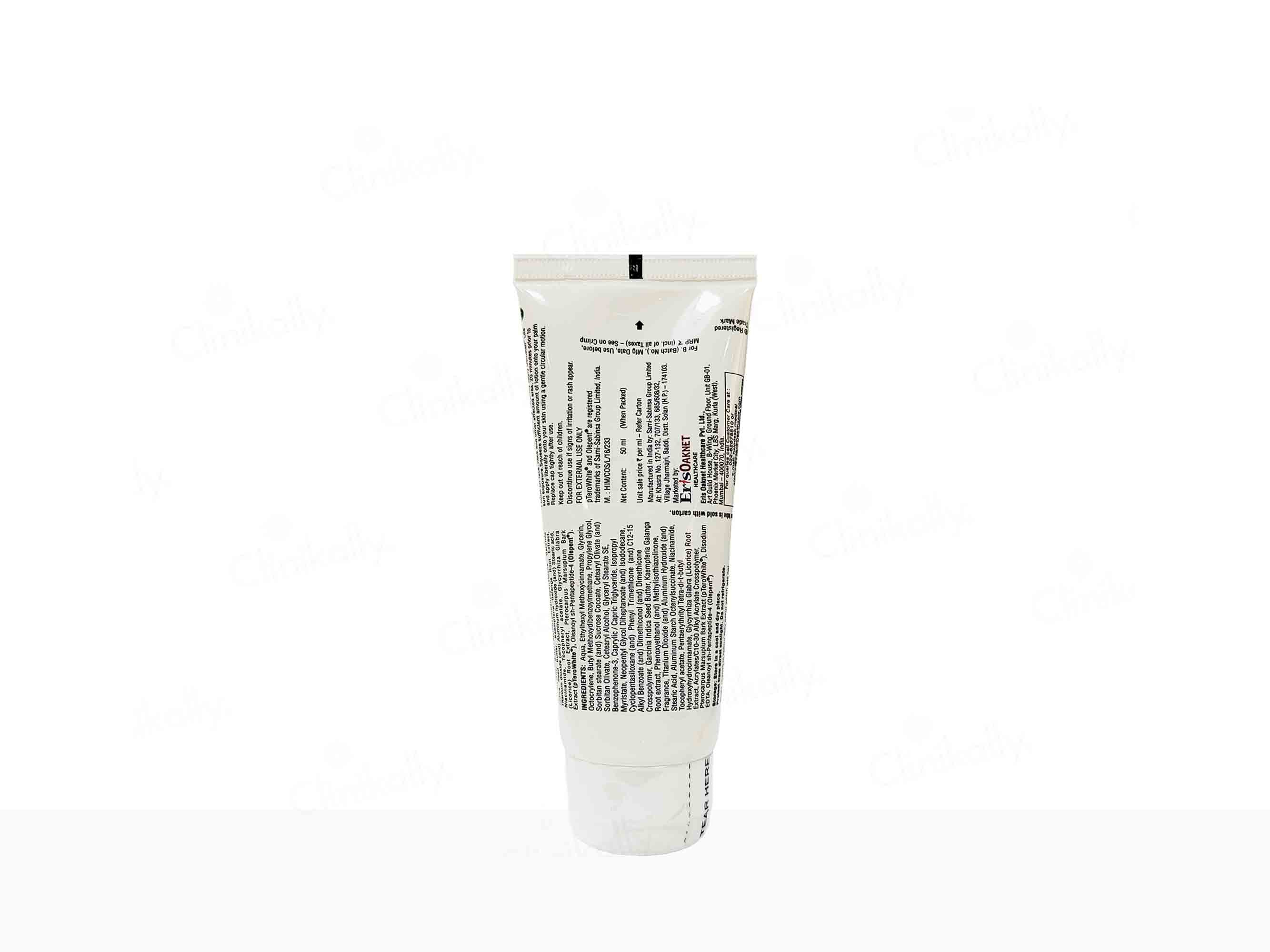 Key ingredients include Garcinia Indica seed butter, Kaempferia galanga root extract, niacinamide, licorice root extract, and vitamins E and C.