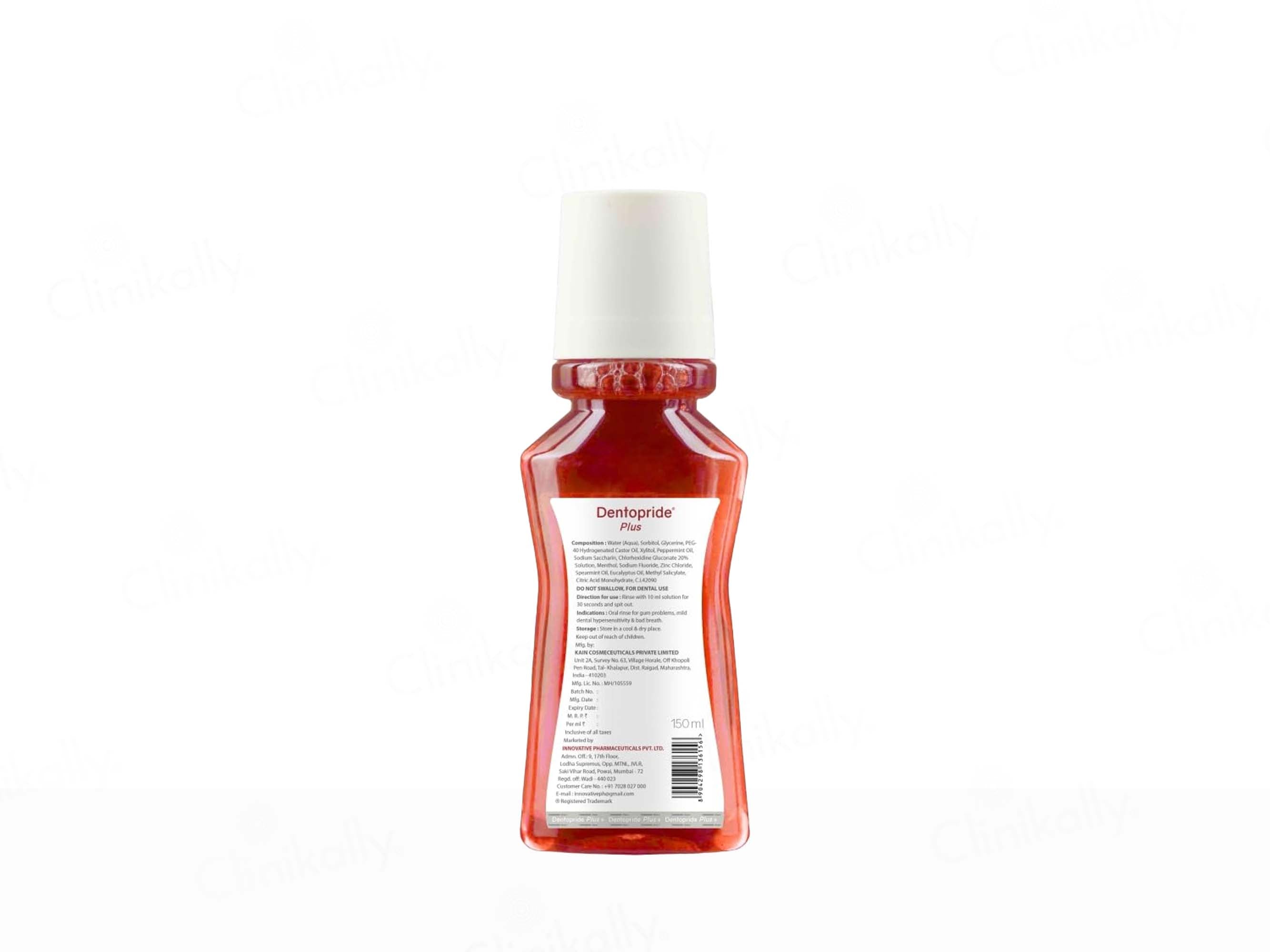 Dentopride Plus+ Mouthwash - Mint Fresh is an oral care product designed to promote healthy gums, combat mild dental hypersensitivity, and eliminate bad breath with an alcohol-free formula suitable for daily use. Enriched with Peppermint Oil, Spearmint Oil, Eucalyptus Oil, Zinc Chloride, and Sodium Fluoride, it removes 99.9% of germs, strengthens enamel, and provides a refreshing mint flavor, enhancing overall oral hygiene. The non-alcoholic, soothing solution delivers visible results with consistent rinsing as directed.
