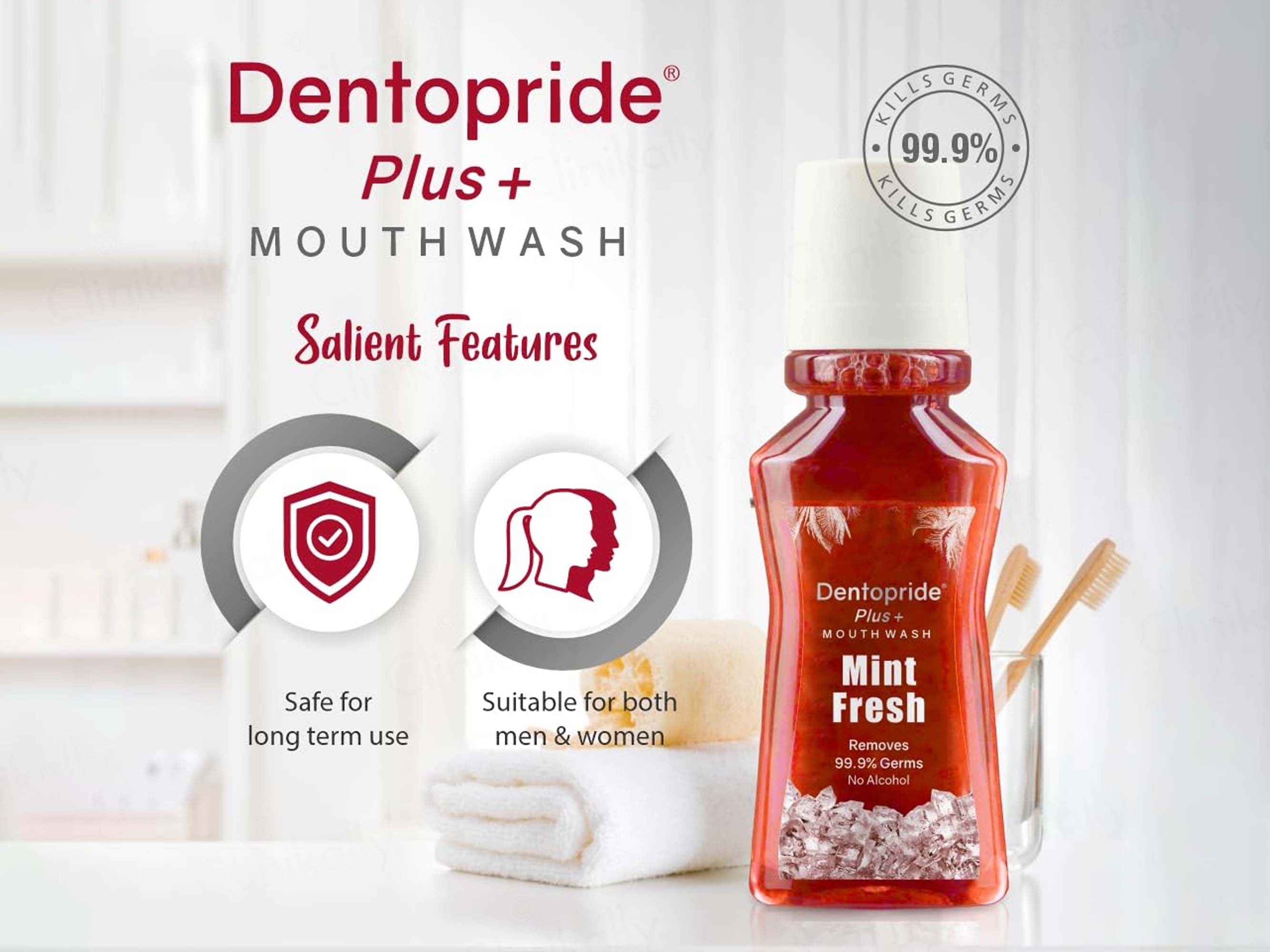 Dentopride Plus+ Mouthwash - Mint Fresh is an alcohol-free mouthwash that removes 99.9% of germs and freshens breath.