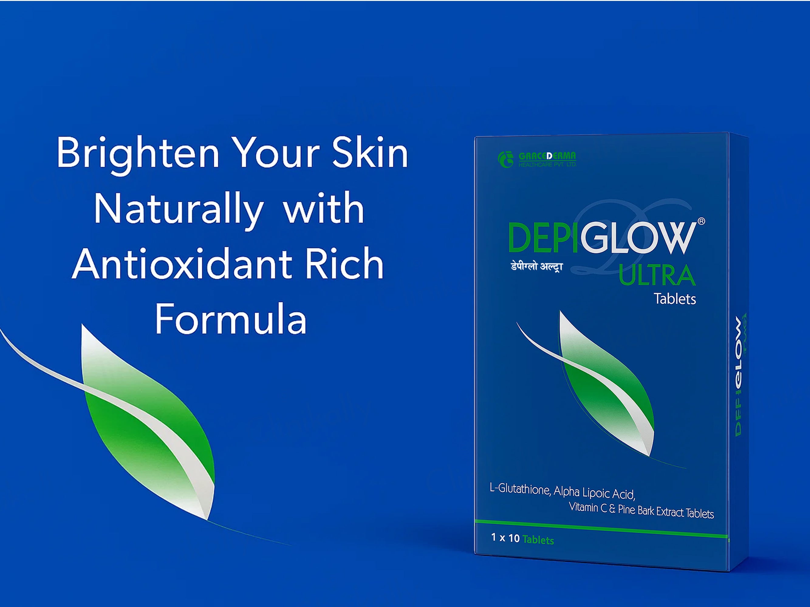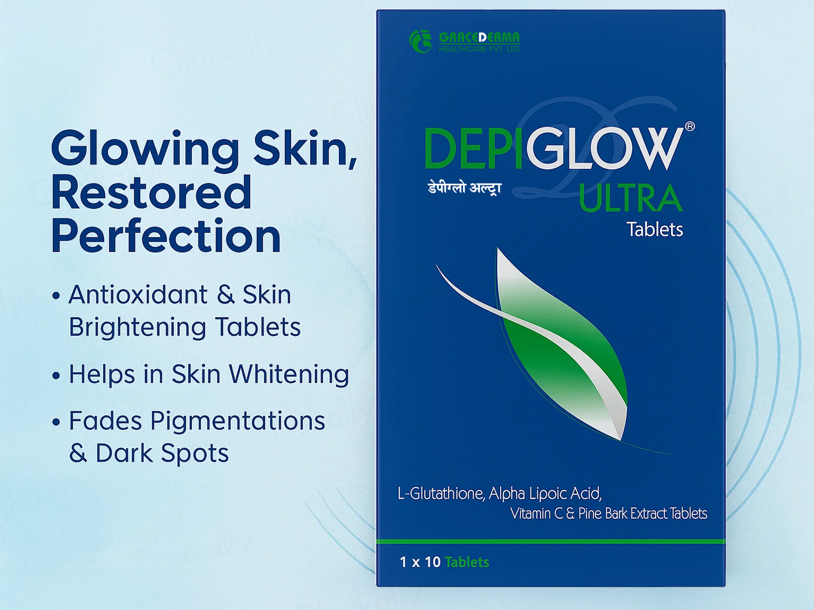 Depiglow Ultra Tablet is a dietary supplement designed to promote skin radiance and reduce hyperpigmentation from within. Formulated with powerful ingredients like L-Glutathione, Vitamin C, Alpha Lipoic Acid, & Pine Bark Extract this tablet works to lighten dark spots, even out skin tone, and enhance overall skin health. It also provides antioxidant protection to combat free radicals and support a youthful complexion. Suitable for all skin types, Depiglow Ultra Tablet is an easy and effective way to achieve brighter, clearer skin.