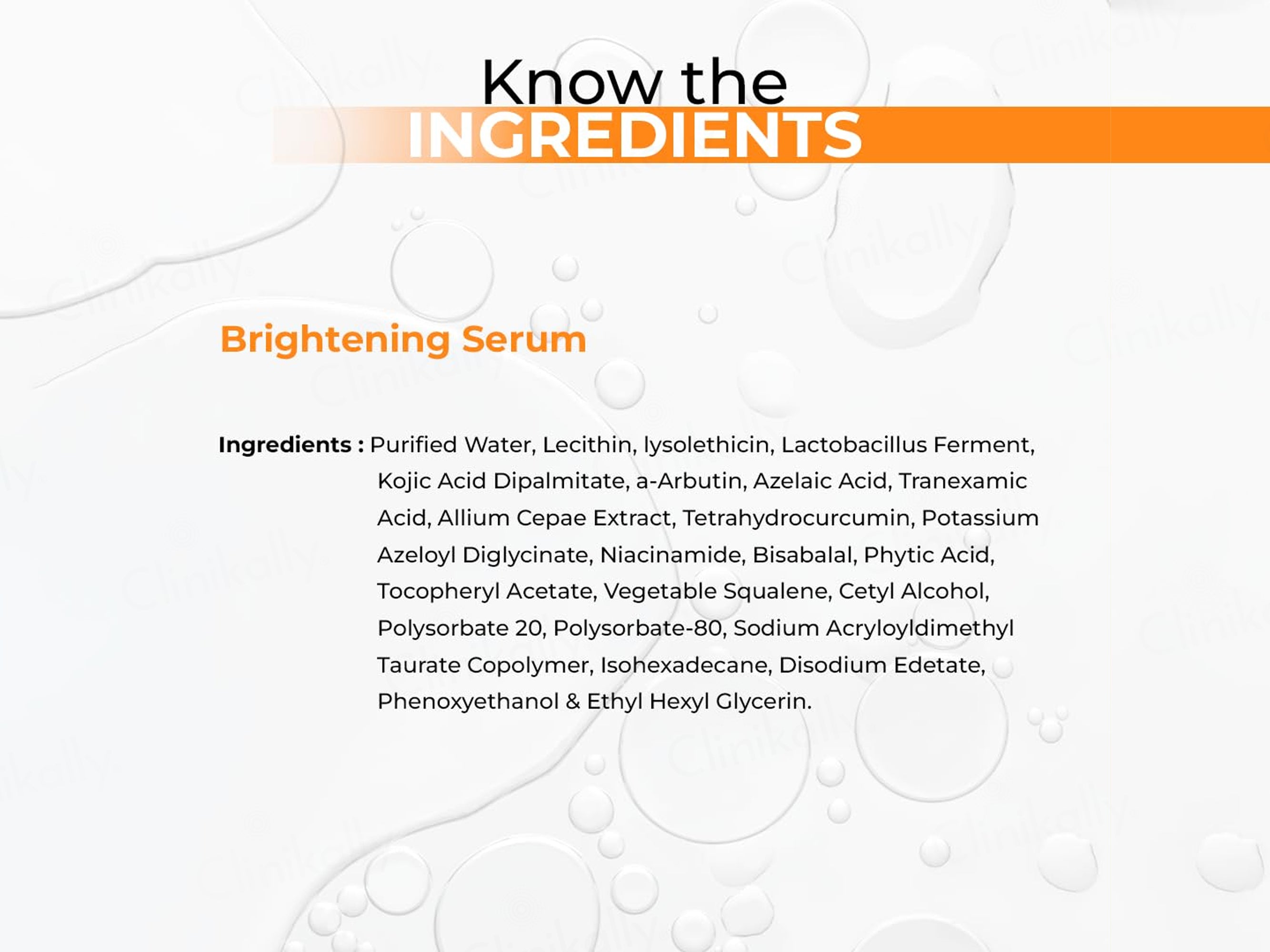 It includes kojic acid, tranexamic acid, alpha arbutin, niacinamide, and mulberry extract.