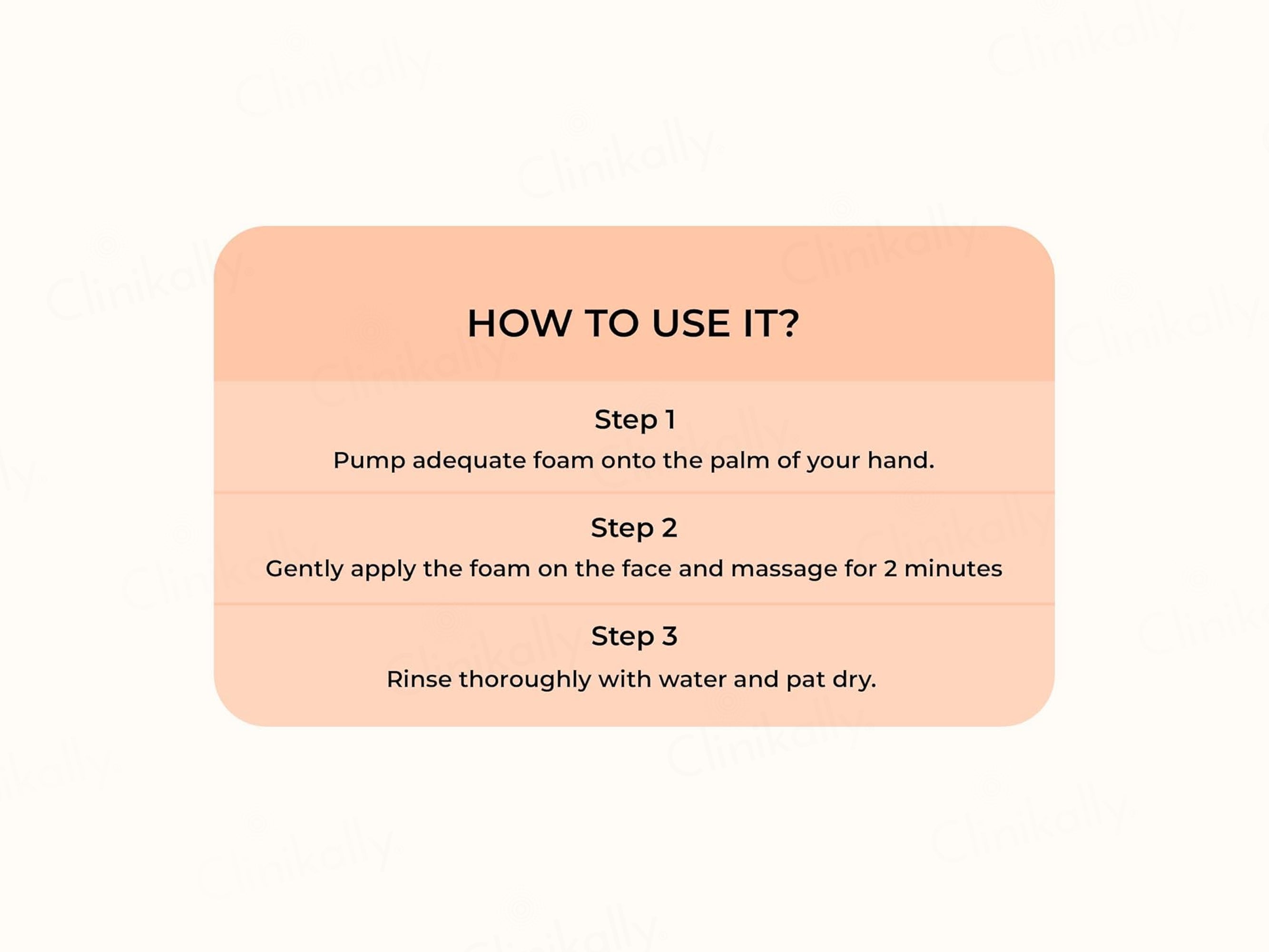 Pump foam onto your palm, apply to your face, massage for 2 minutes, then rinse with lukewarm water and pat dry.