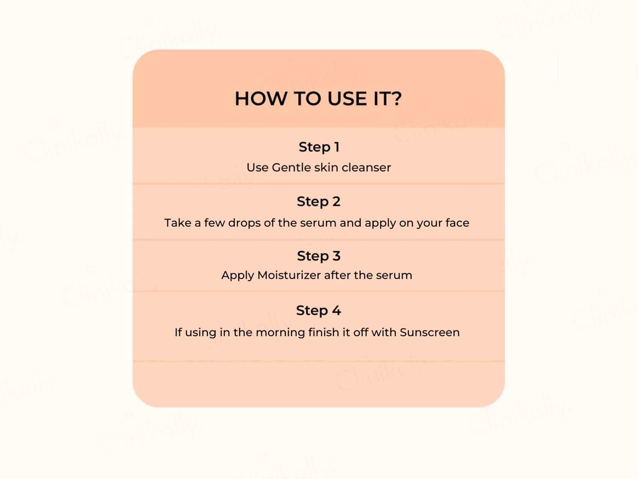Use a gentle skin cleanser, apply a few drops on your face, follow with moisturizer, and finish with sunscreen if used in the morning.