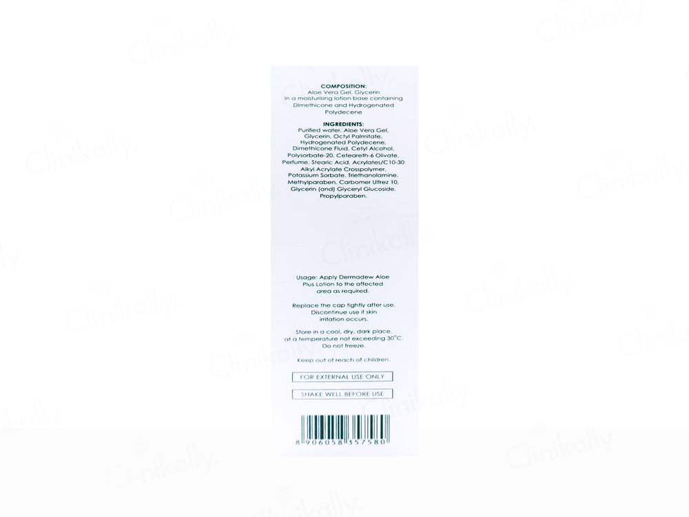Dermadew Aloe Plus Moisturiser Lotion is a soothing and hydrating skincare solution designed to nourish and protect the skin. Formulated with Aloe Vera Gel and Glycerin, it provides deep moisturization and helps calm irritated skin. The lotion features a moisturizing base containing Dimethicone and Hydrogenated Polydecene, which create a protective barrier to lock in moisture and keep skin soft and supple. Enriched with additional emollients like Octyl Palmitate, Cetyl Alcohol, and Olivate, it ensures long-lasting hydration while maintaining skin elasticity. Ideal for all skin types, especially dry and sensitive skin, this lotion soothes, moisturizes, and leaves skin feeling refreshed and revitalized.