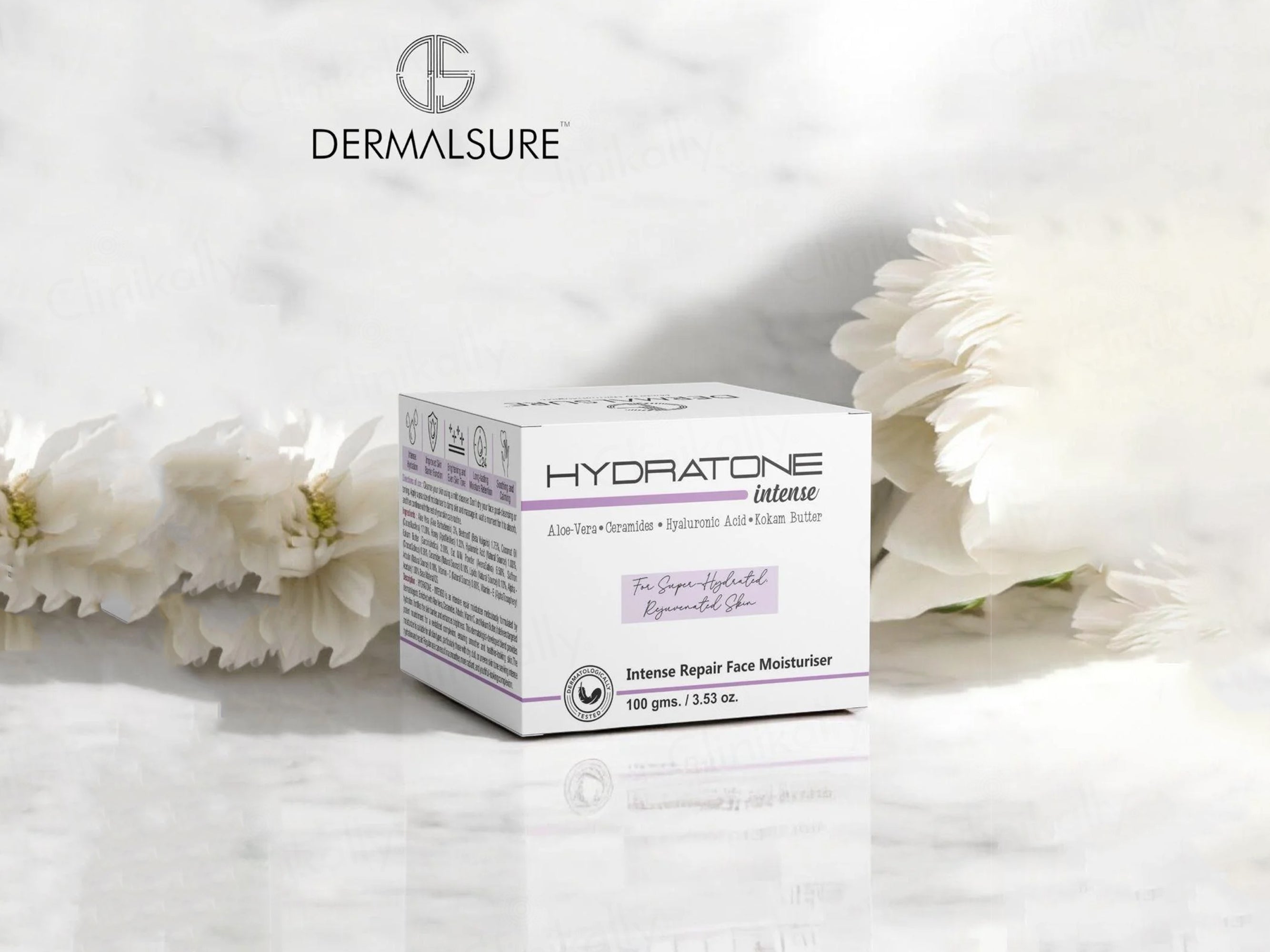 Dermalsure Hydratone Intense Repair Face Moisturiser is a deeply hydrating formula crafted to restore skin moisture, improve barrier health, and promote long-lasting softness. Enriched with aloe vera, ceramides, hyaluronic acid, kokum butter, and natural botanicals, it works to calm inflammation, nourish dry or sensitive skin, and support even skin tone. Ideal for daily use, the rich creamy texture sinks into skin without heaviness, offering visible softness and radiance. Suitable for all skin types, including those with dry, dull, or uneven skin, it enhances hydration retention and leaves skin looking revitalized and plump.