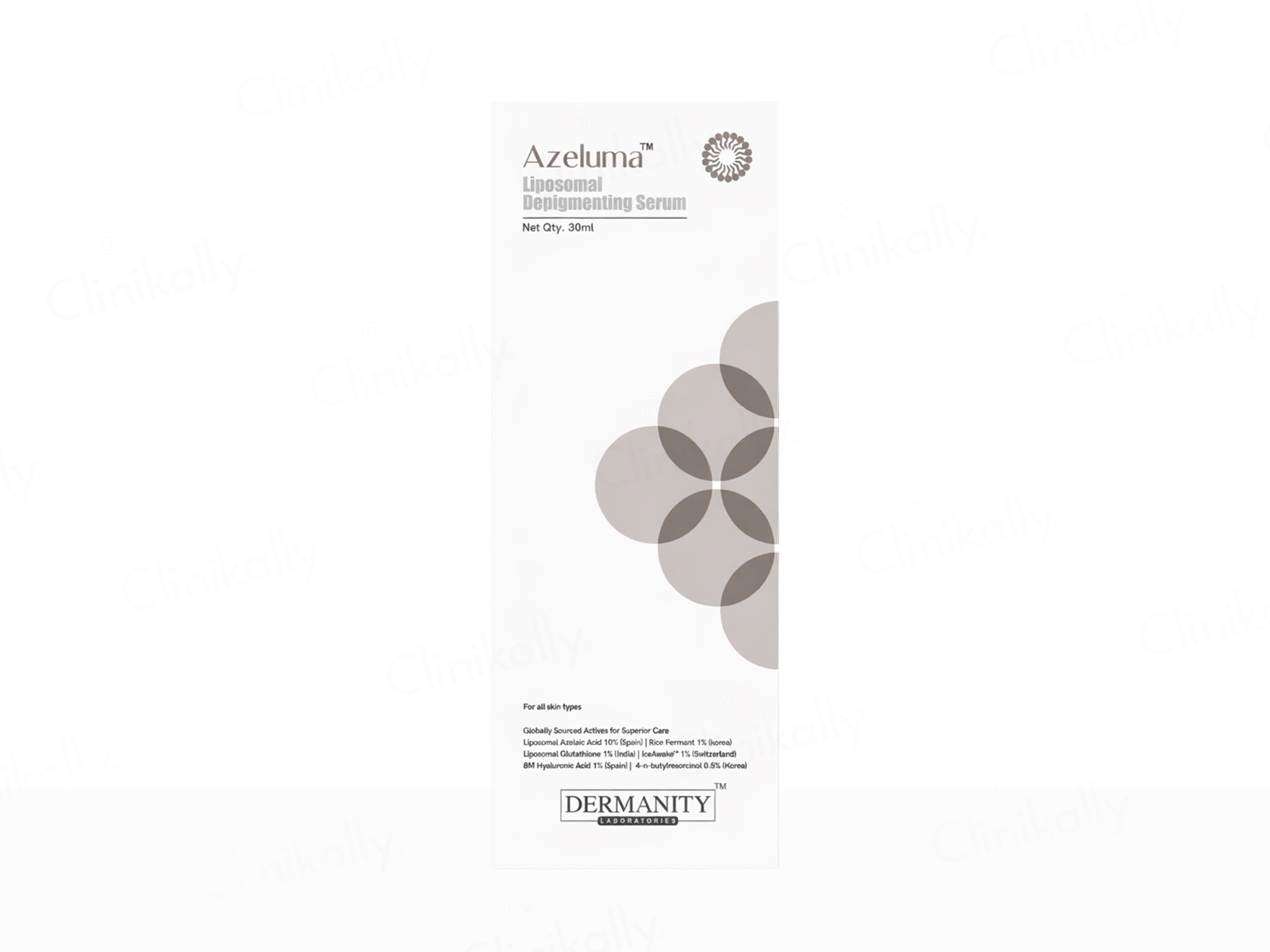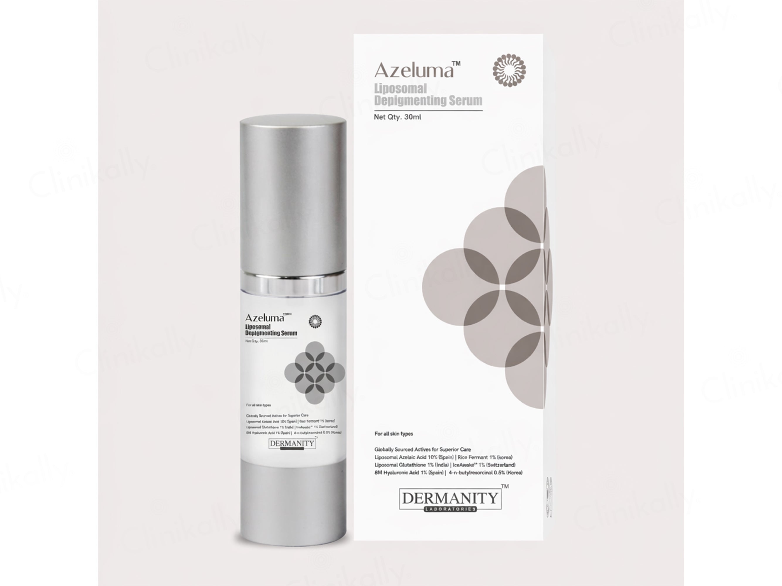 Dermanity Azeluma Liposomal Depigmenting Serum highlights Liposomal Azelaic Acid and Niacinamide as key ingredients.