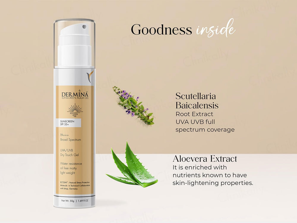 Dermina Aqua Dry Touch Gel Sunscreen SPF 35+ PA+++ is a broad-spectrum sunscreen that protects skin from UVA/UVB rays while providing a lightweight, non-oily, matte finish.