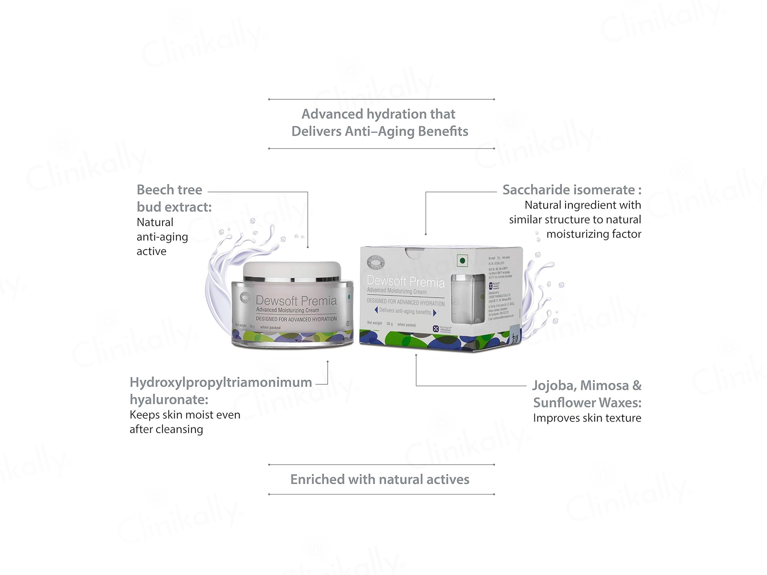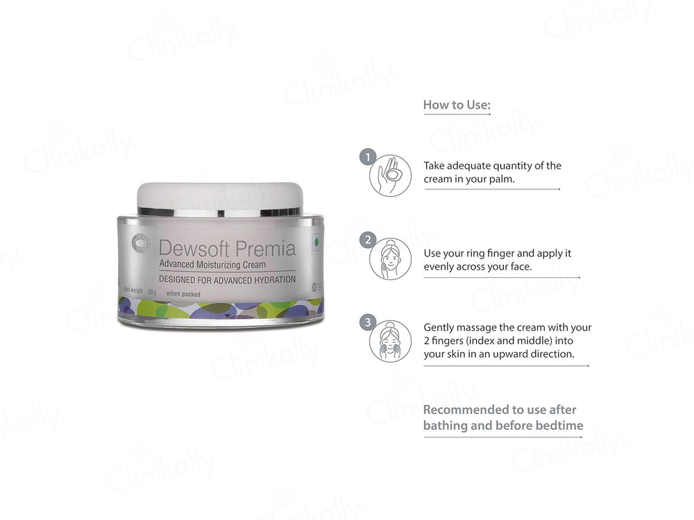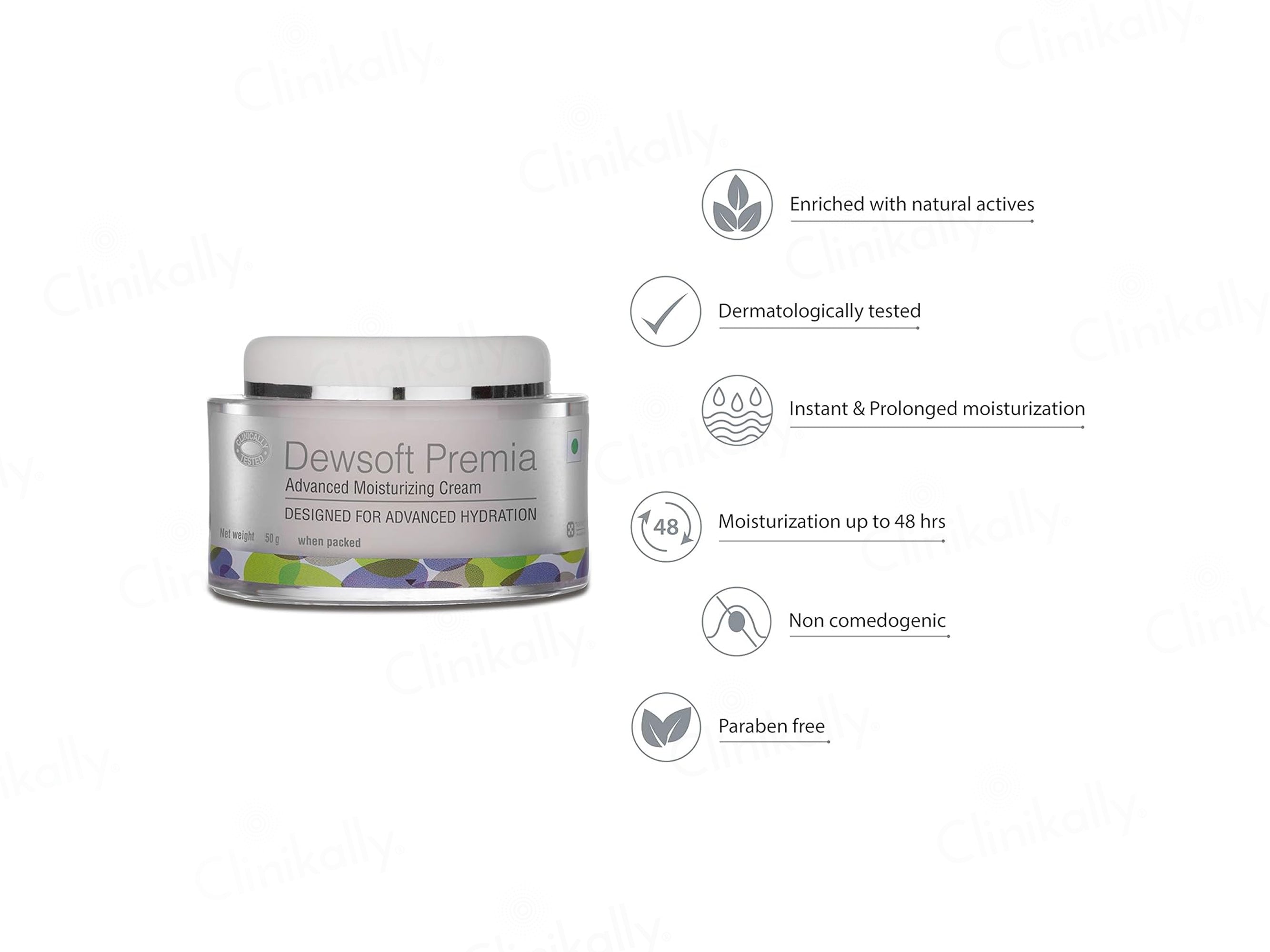 Dewsoft Premia Advanced Moisturizing Cream provides hydration for 48 hours, reduces fine lines and wrinkles, and delivers anti-aging benefits.