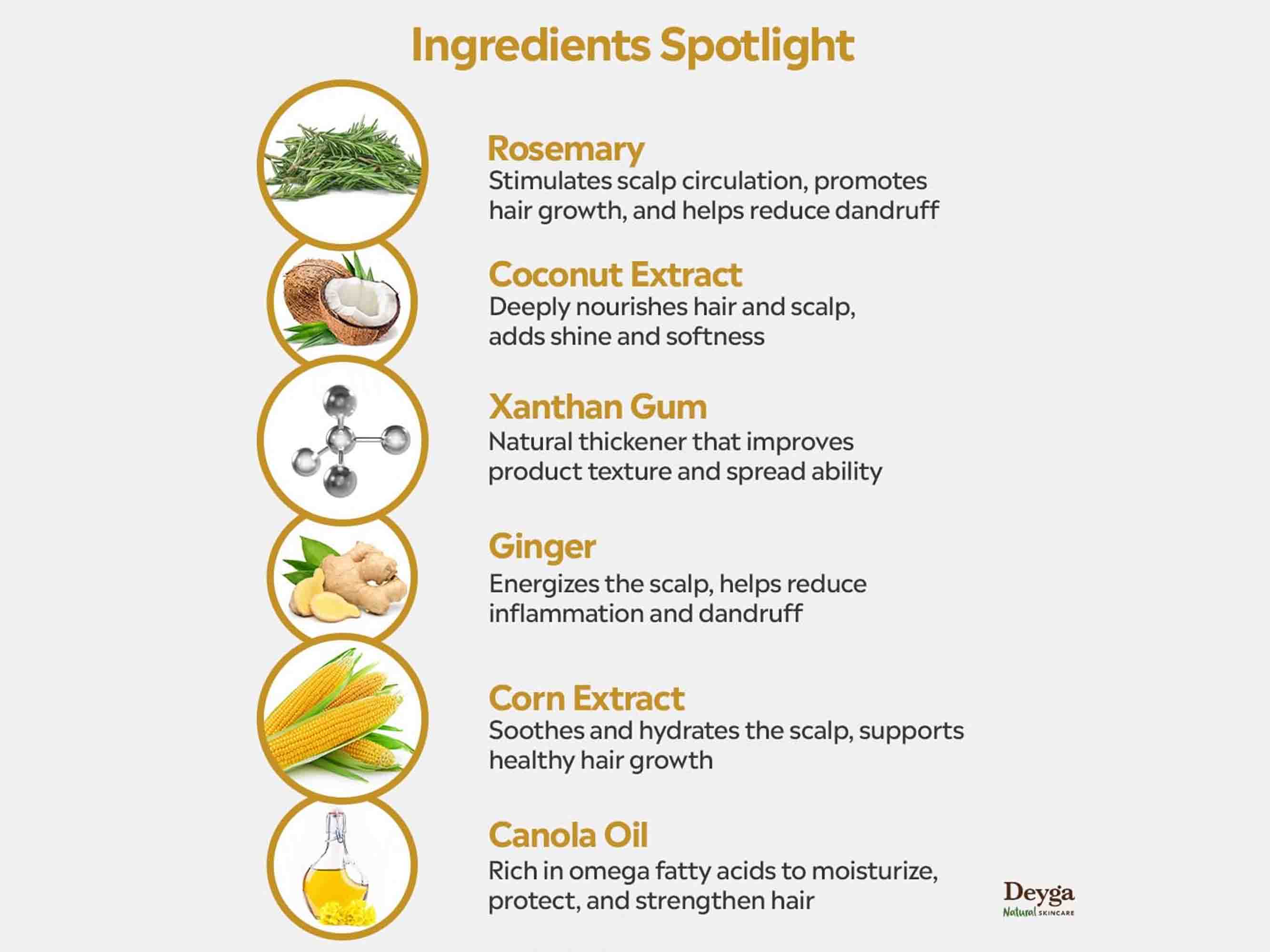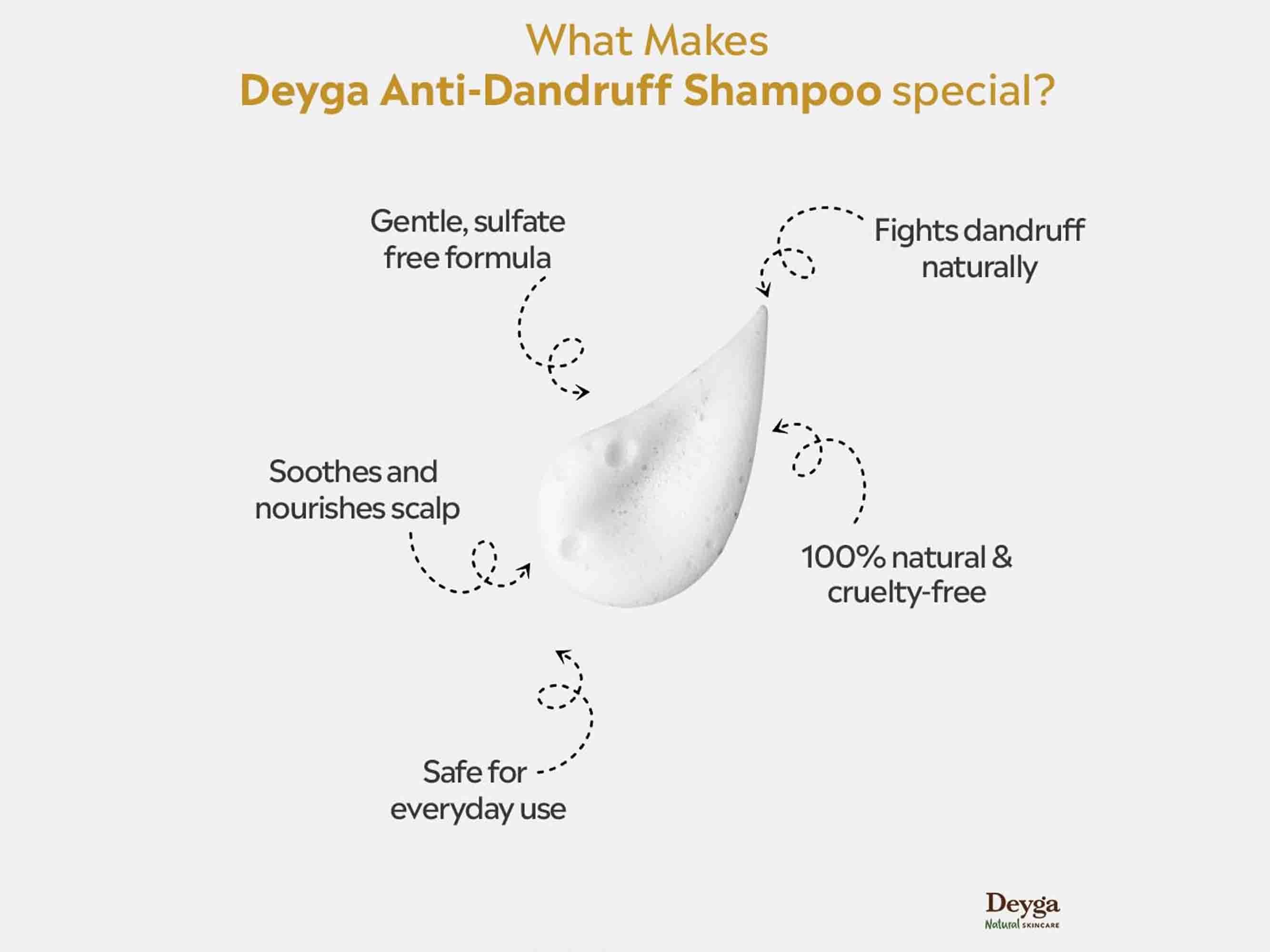 Deyga Anti Dandruff Shampoo is a power-packed, 100% natural, vegan formula designed to fight dandruff by soothing dry, itchy scalps and leaving them clean and refreshed without harsh chemicals, featuring key ingredients like Rosemary Extract, Ginger Extract, Coconut Extract, Corn Extract, Canola Oil, and Xanthan Gum for clarifying cleanse, soothing relief, nourishing moisture, and deep cleansing that controls flakes, prevents dryness, balances oil production, reduces itchiness, and promotes a healthy scalp for all hair types including sensitive. This paraben-, sulphate-, and silicone-free shampoo penetrates deeply to eliminate impurities, repair irritation, and restore balance with antifungal and antimicrobial properties from botanicals, delivering flake-free, nourished hair with consistent use 2-3 times weekly.