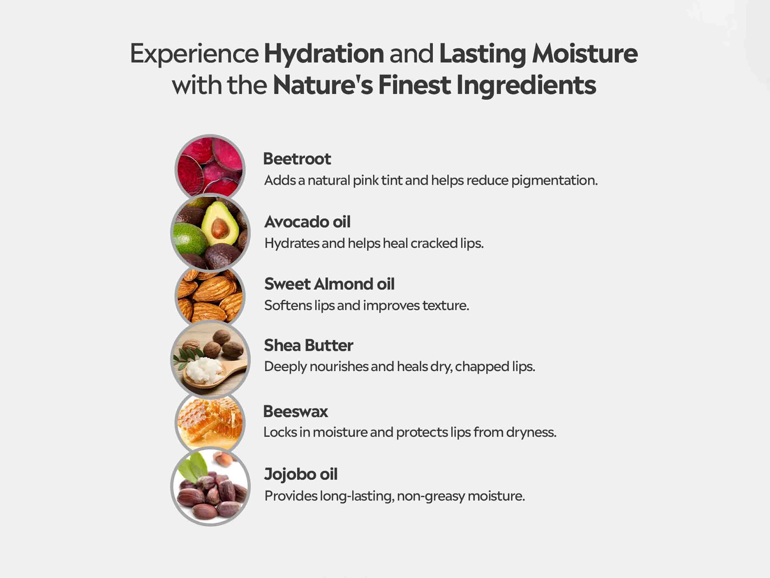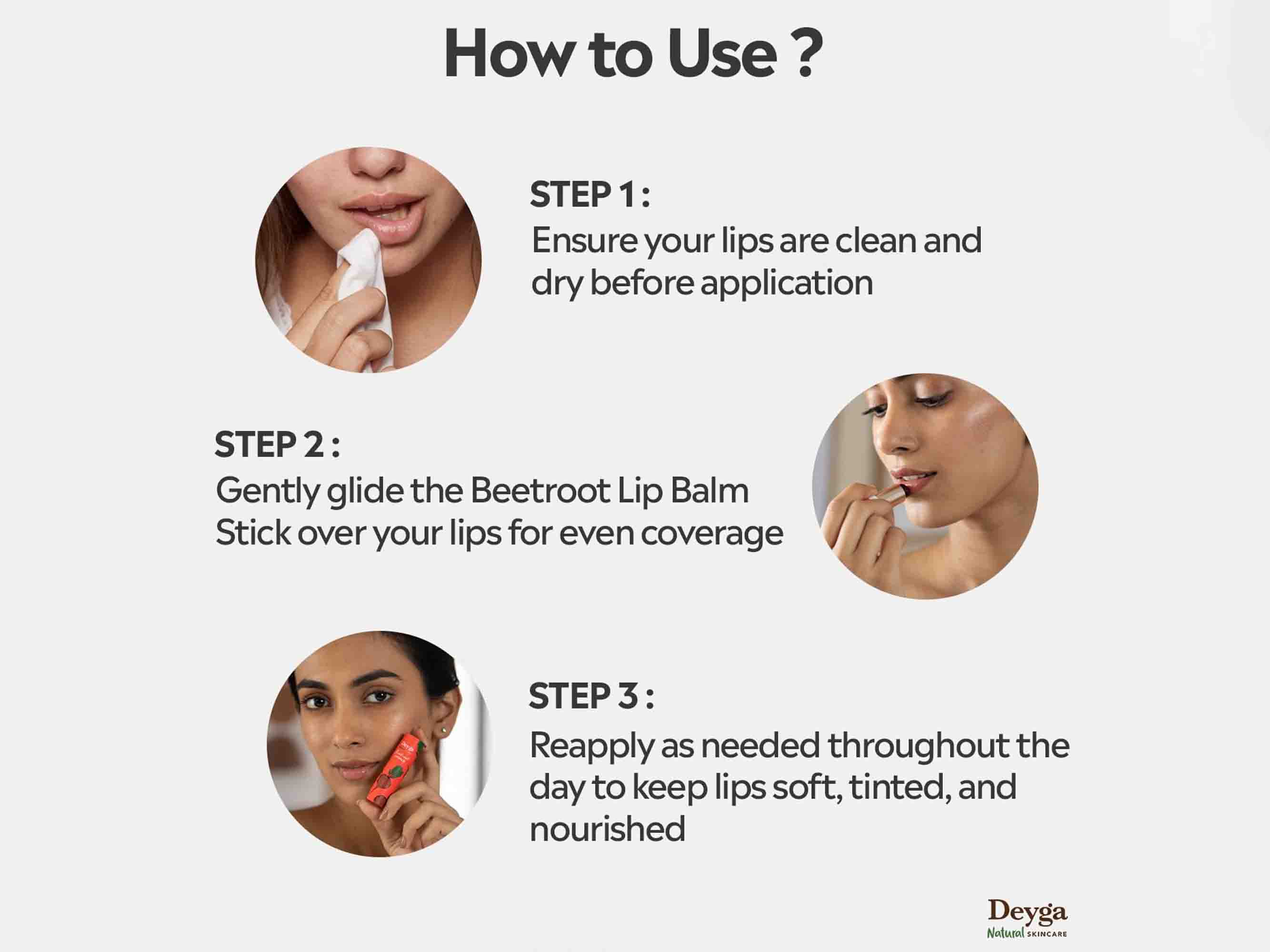 Deyga Beetroot Lip Balm is a 100% natural, handcrafted, organic formula delivering 8+ hours of intense hydration to heal dry, chapped lips while providing a subtle rosy tint and nourishment for supple, smooth, pigmented lips suitable for all genders and daily use, featuring key ingredients like Beetroot Extract, Shea Butter, Avocado Oil, Almond Oil, Jojoba Oil, and Beeswax for long-lasting moisture, antioxidant protection, reduced pigmentation, softened cuticles, and a natural shine without harsh chemicals or preservatives when applied generously as needed.