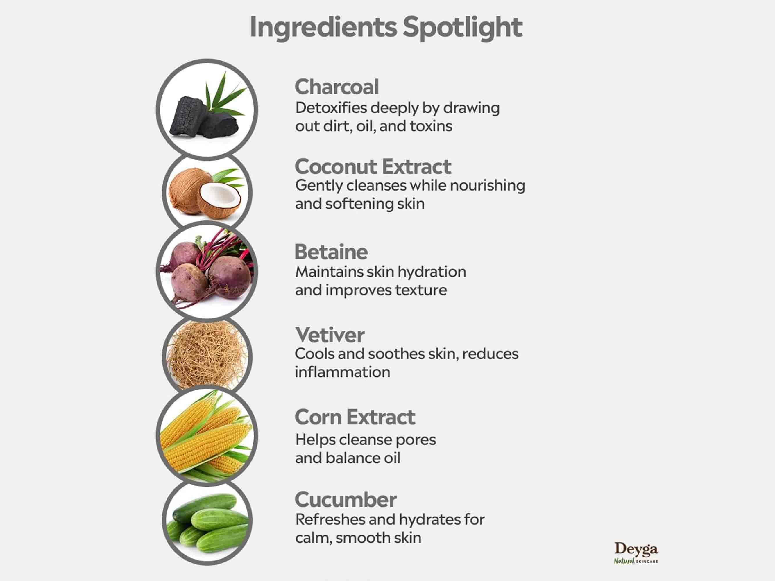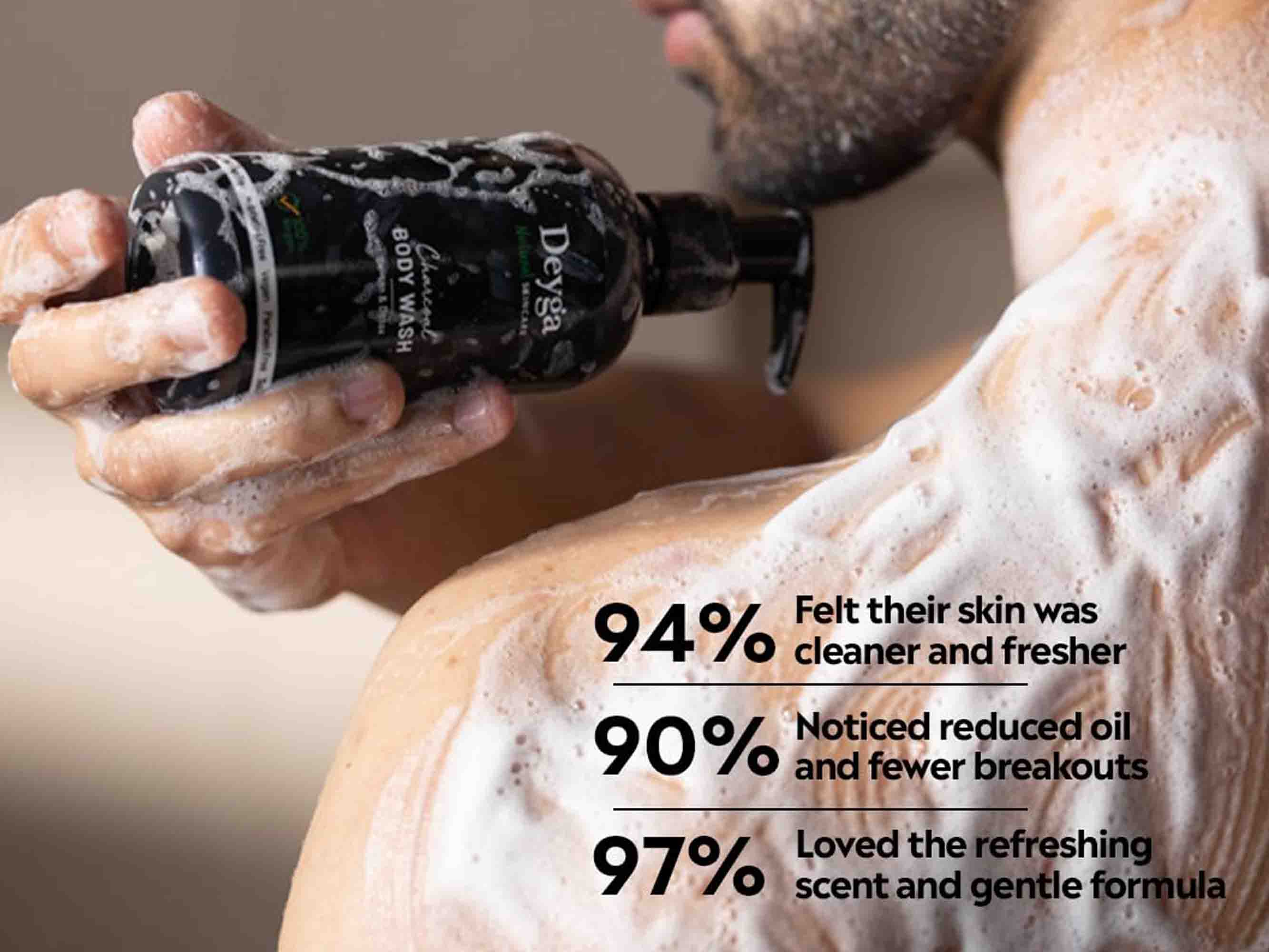 Deyga Charcoal Body Wash De-Tan & Detox is a 100% natural, vegan, and handcrafted deep-cleansing gel infused with purifying botanicals to detoxify, exfoliate, and balance all skin types, tackling dirt, sweat, excess oil, and impurities while gently removing tan, lightening pigmentation, and preventing breakouts for fresh, rejuvenated, oh-so-clean skin that feels smooth and radiant after every shower. Free from parabens, sulfates, synthetic fragrances, or preservatives in a 220ml pump bottle, it harnesses key ingredients like Activated Charcoal for pore-deep detox and de-tan, Vetiver Root Extract for soothing balance, Coconut Extract for hydrating nourishment, Corn Extract for gentle exfoliation, Cucumber Extract for calming refreshment, and Betaine for moisture retention without stripping the barrier, making it ideal for daily use on face and body, especially for oily, acne-prone, or sun-exposed skin to promote a calm, confident glow for men and women.