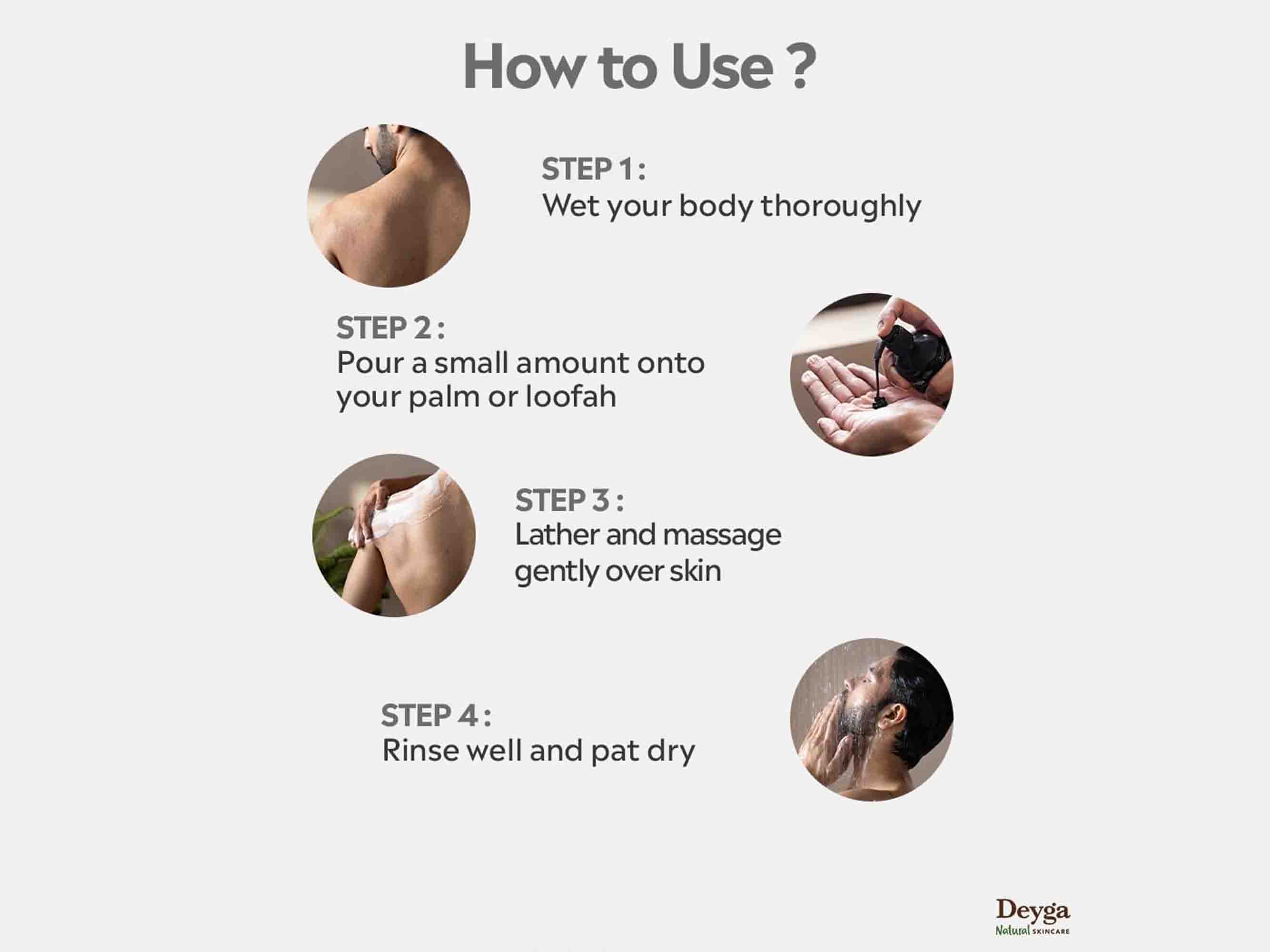- Wet your skin, dispense a small amount of Deyga Charcoal Body Wash De-Tan & Detox onto a loofah or hands, lather gently, massage in circular motions over body and face, then rinse thoroughly; use daily during showers for optimal detox and de-tan results.
