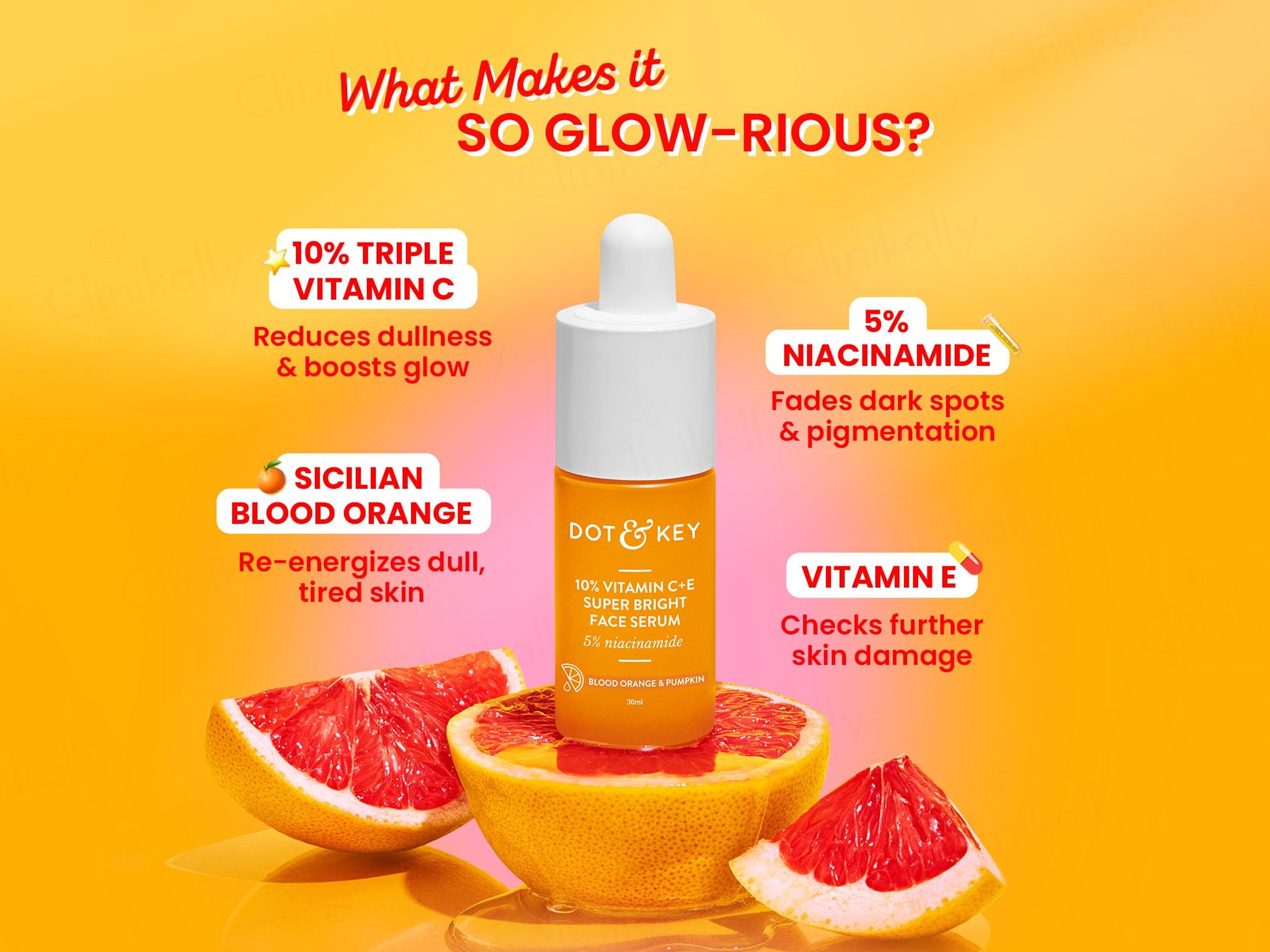 Dot & Key 10% Vitamin C + E Super Bright Face Serum is a lightweight, beginner-friendly formula designed to visibly reduce dullness, fade dark spots, treat pigmentation, and boost glow for radiant, even-toned skin, enriched with 10% Triple Vitamin C for brightening and antioxidant protection, 5% Niacinamide to fade hyperpigmentation and balance skin, Vitamin E to check further damage and nourish, along with key natural extracts like Sicilian Blood Orange to re-energize tired skin and Pumpkin for added soothing and revitalization, suitable for all skin types with a non-sticky, fragrance-free texture that absorbs quickly without irritation.