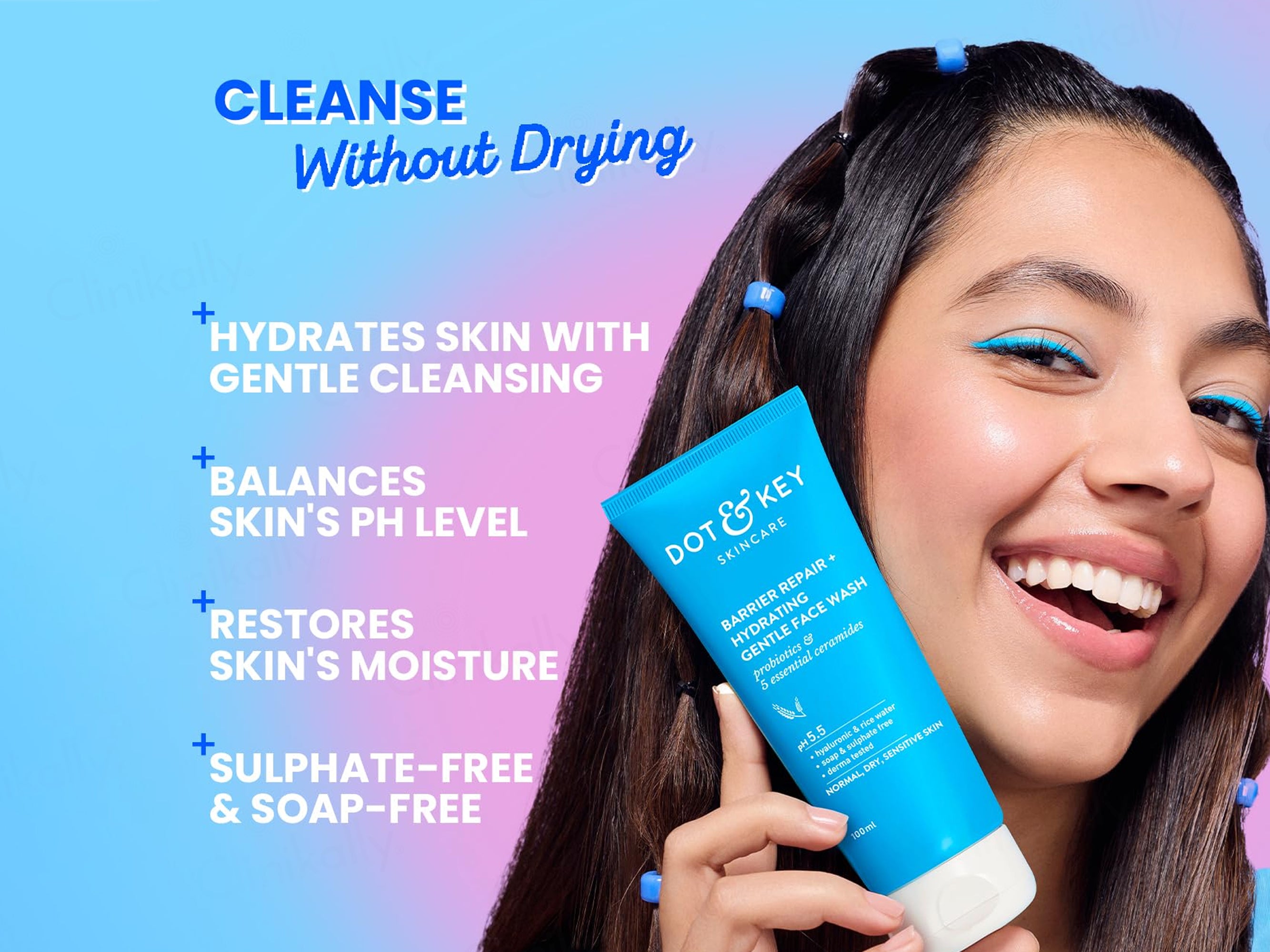 Dot & Key Barrier Repair + Hydrating Gentle Face Wash is an ultra-mild, sulphate-free cleanser designed for normal, dry, and sensitive skin to gently remove dirt, oil, makeup, and sunscreen without over-drying or stripping natural moisture, while restoring pH balance at 5.5, repairing damaged skin barrier, and providing intense hydration for plump, resilient skin, infused with 5 Ceramides to strengthen the barrier, Hyaluronic Acid for instant deep hydration, Probiotics to balance the skin microbiome, and Japanese Rice Water to soothe inflammation, featuring a non-drying, fragrance-free, soap-free formula that's dermatologist-tested and suitable for daily use.