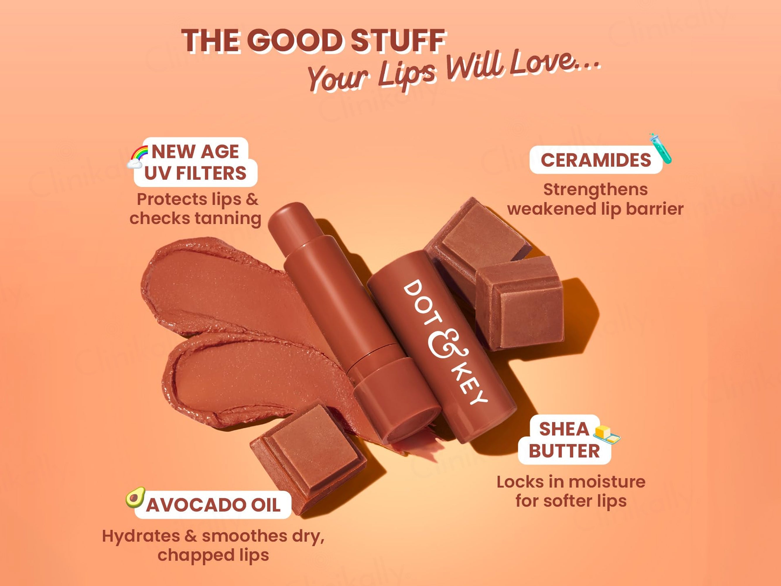 Dot & Key Barrier Repair Hydrating Tinted Lip Balm SPF 50 PA+++ (Cocoa Nude) is a nourishing stick-formula lip balm designed to deeply hydrate, repair the damaged lip barrier, and shield against UVA/UVB rays with broad-spectrum SPF 50 protection while imparting a subtle medium cocoa nude tint for a natural, plump shine. Infused with ceramides and peptides to lock in moisture and soothe chapped lips, it features key ingredients like Ceramide NP, Sodium Hyaluronate, Shea Butter, Avocado Oil, Tocopheryl Acetate, Laminaria Digitata Extract, Acetyl Hexapeptide-8, Theobroma Cacao Seed Butter, and Persea Gratissima Oil for long-lasting softness and plumping effects without any greasy residue. This tinted balm prevents pigmentation and dryness, making it ideal for daily use on all skin types, especially dry or sun-exposed lips, delivering comfortable, mess-free application with a delightful cocoa flavor.