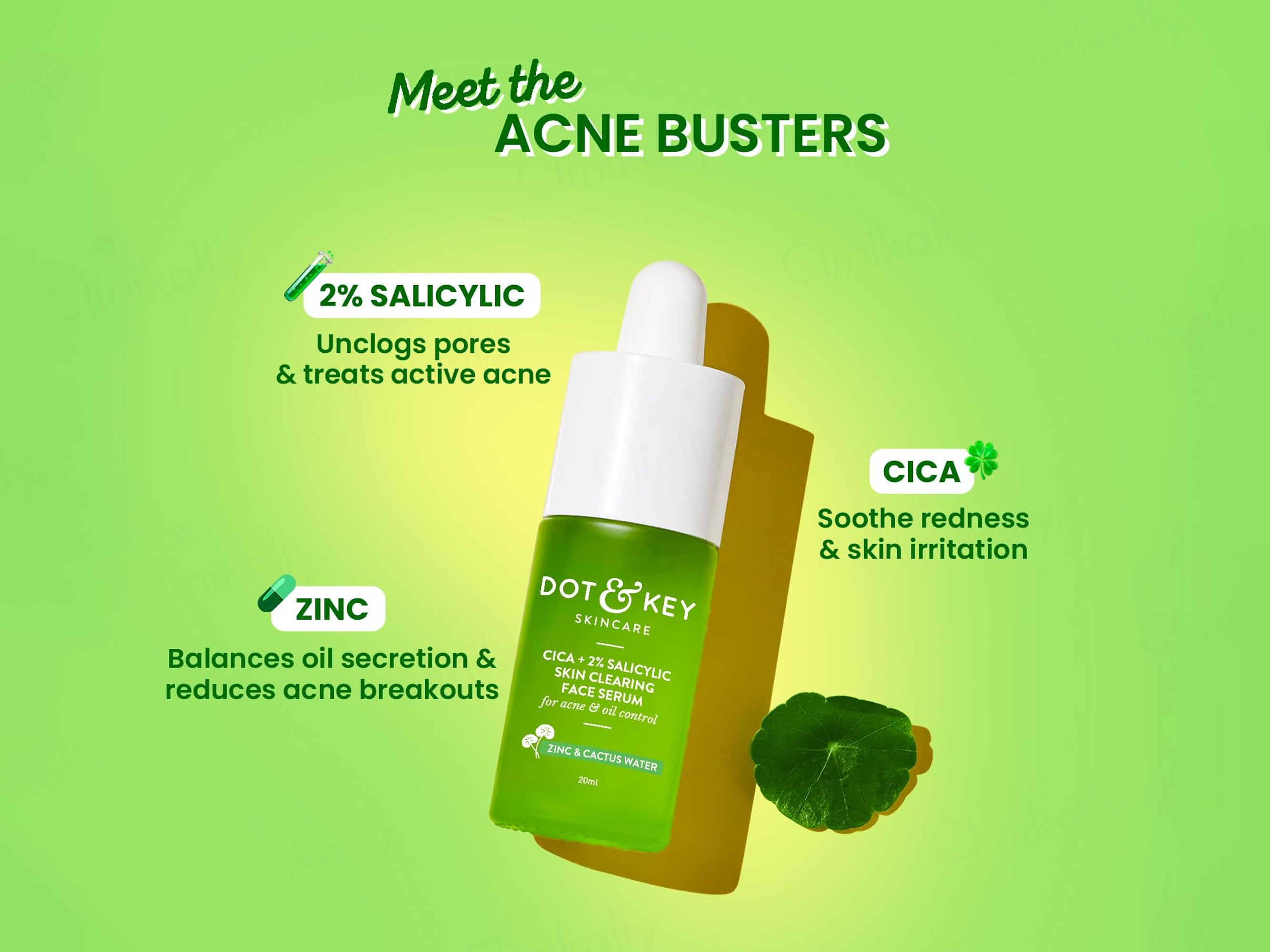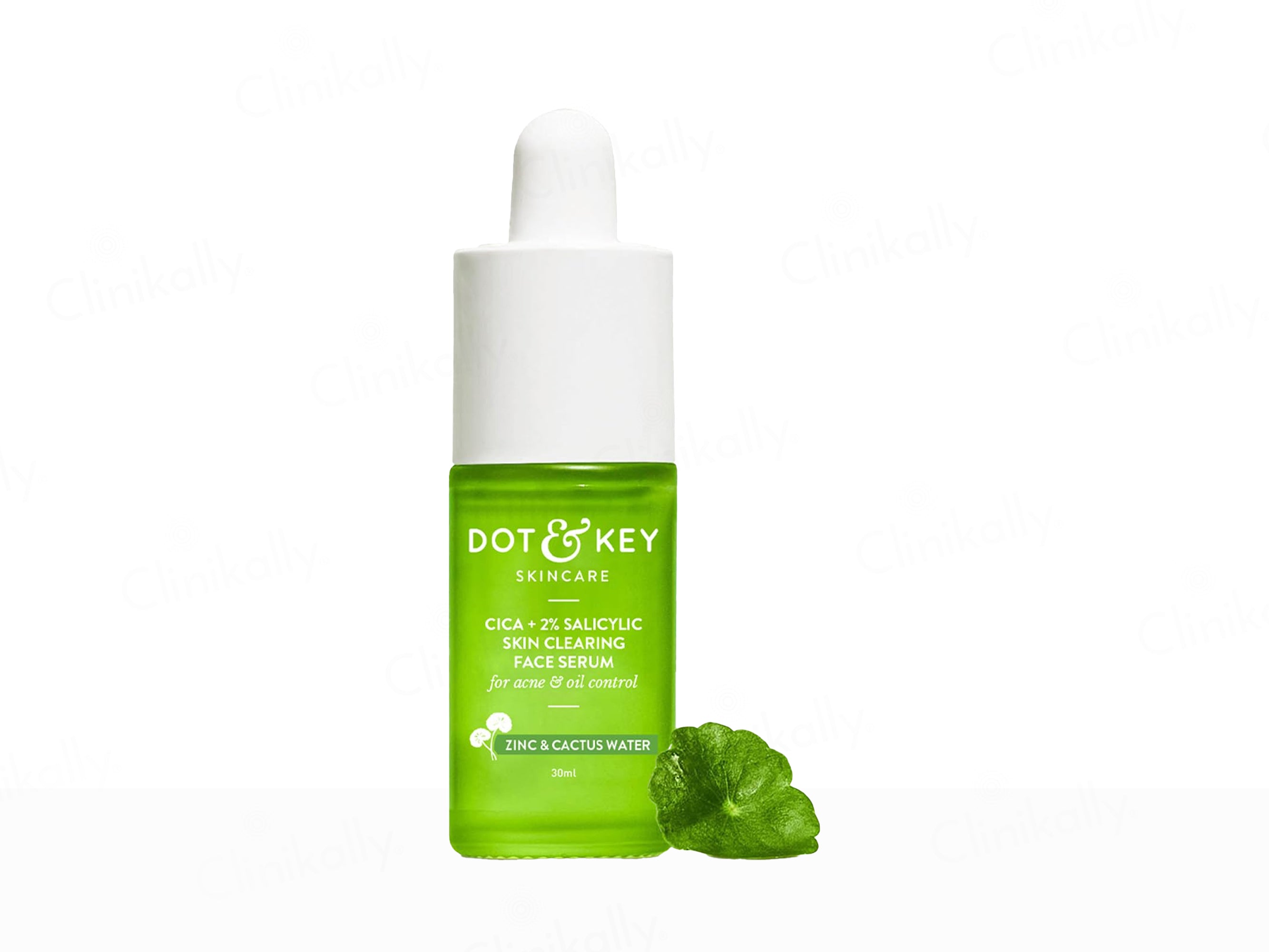 - Cleanse face, apply 3-4 drops of Dot & Key Cica + 2% Salicylic Skin Clearing Face Serum to targeted areas or full face, pat gently to absorb, and follow with moisturizer; use AM/PM, starting every other day if sensitive, and always apply sunscreen in the morning.