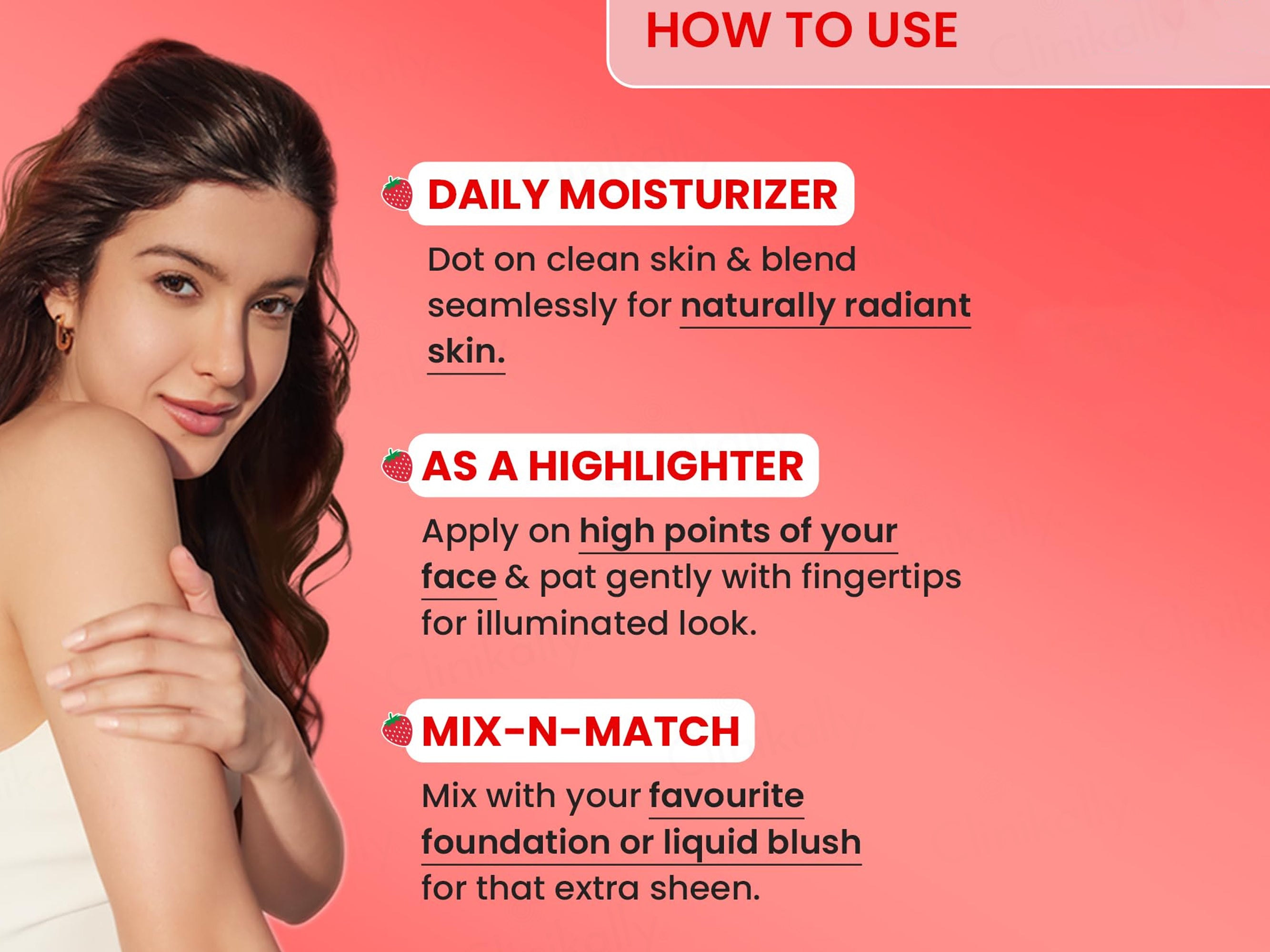 - As daily moisturizer: Dot a pea-sized amount on clean skin and blend seamlessly; as highlighter: Apply on high points of face and pat with fingertips; mix with foundation or liquid blush for added sheen—use AM/PM as needed.