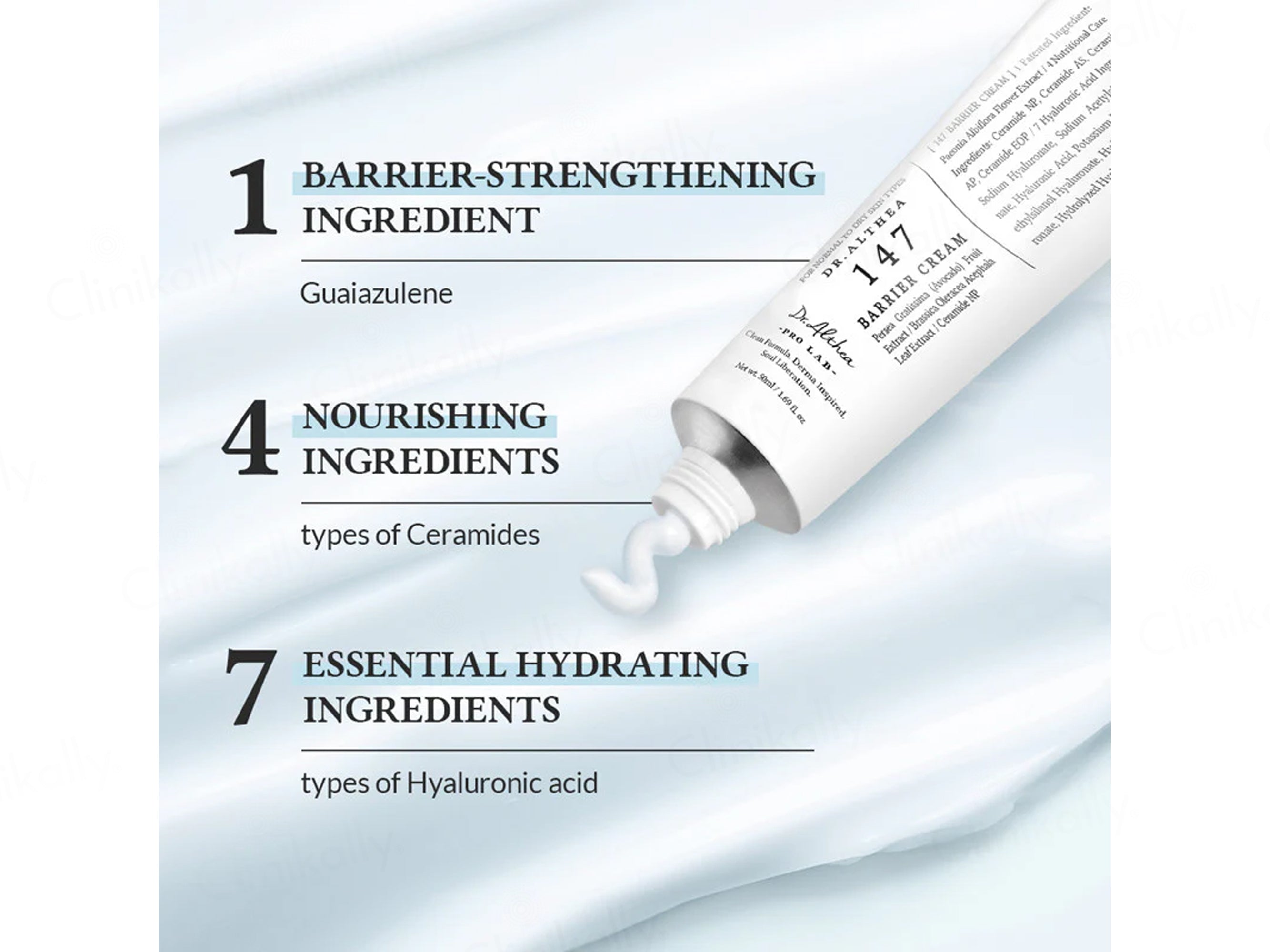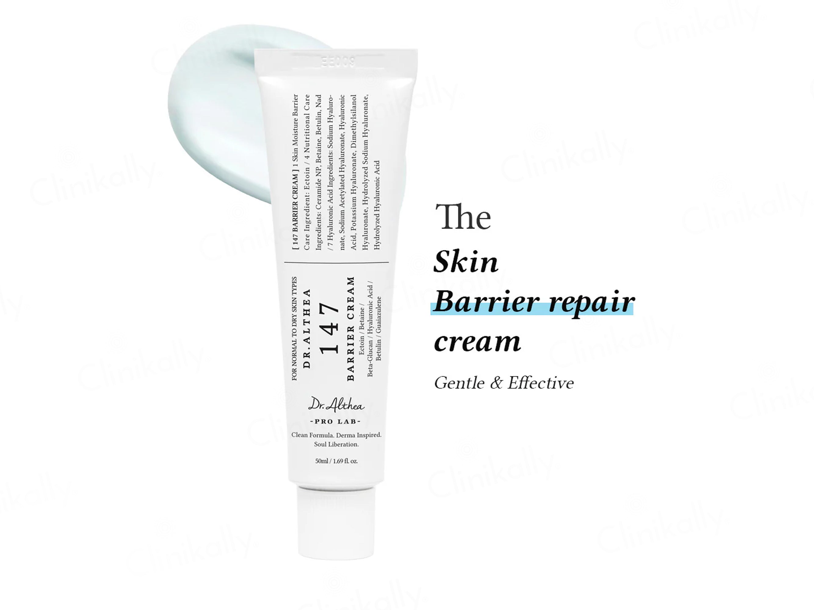 Dr. Althea 147 Barrier Cream is a deeply nourishing barrier-repair moisturizer designed for normal to dry skin types, formulated with a patented ingredient Paeonia Albiflora Flower Extract along with a blend of ceramides, botanical extracts, and multiple forms of hyaluronic acid to strengthen the skin barrier, lock in moisture, and soothe sensitive or damaged skin, featuring nutrient-rich components like Persea Gratissima (Avocado) Fruit Extract and Brassica Oleracea Acephala Leaf Extract combined with Ceramide NP and advanced hydration complexes that help restore skin resilience, improve elasticity, and deliver long-lasting hydration while protecting against external stressors and dryness.