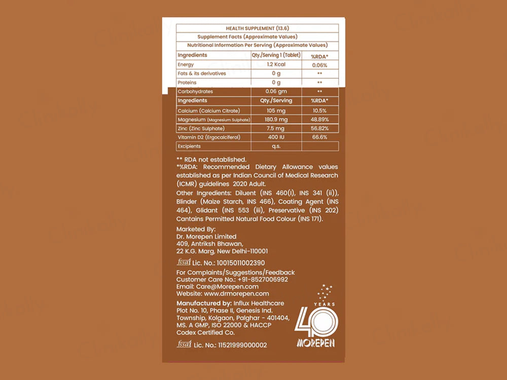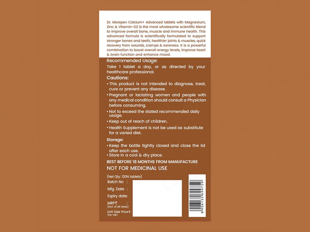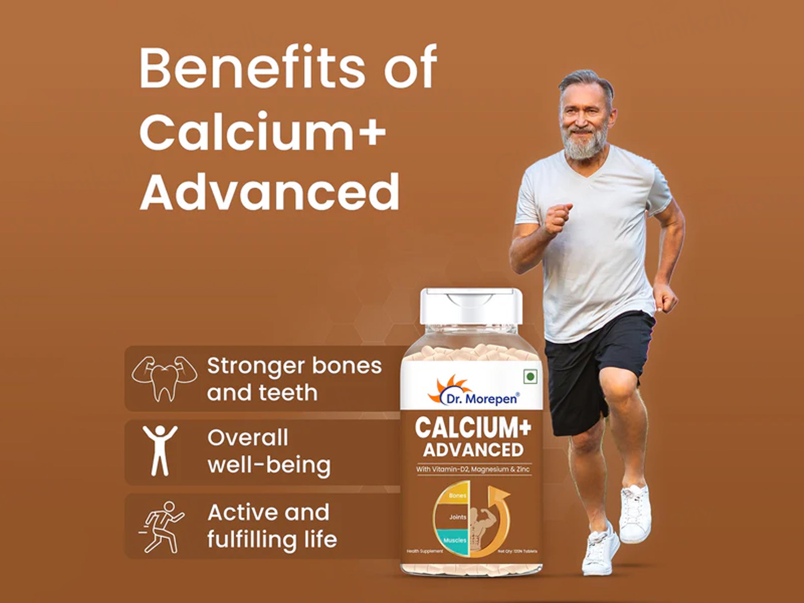 Dr. Morepen Calcium+ Advanced Tablet is a dietary supplement formulated to support bone health and overall well-being. Each tablet contains a blend of calcium, magnesium, zinc, and vitamin D, essential nutrients that work synergistically to maintain strong bones and support various bodily functions. Regular intake may help prevent calcium deficiencies, promote healthy muscle function, and enhance immune system performance. This supplement is ideal for individuals seeking to maintain optimal bone density and general health.