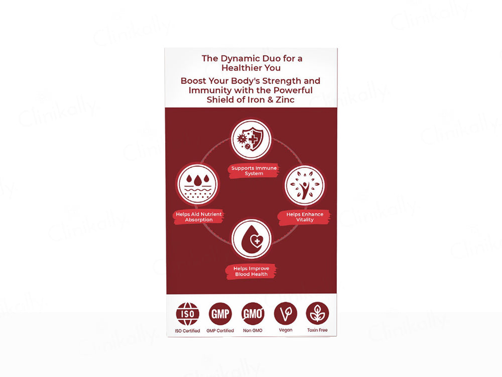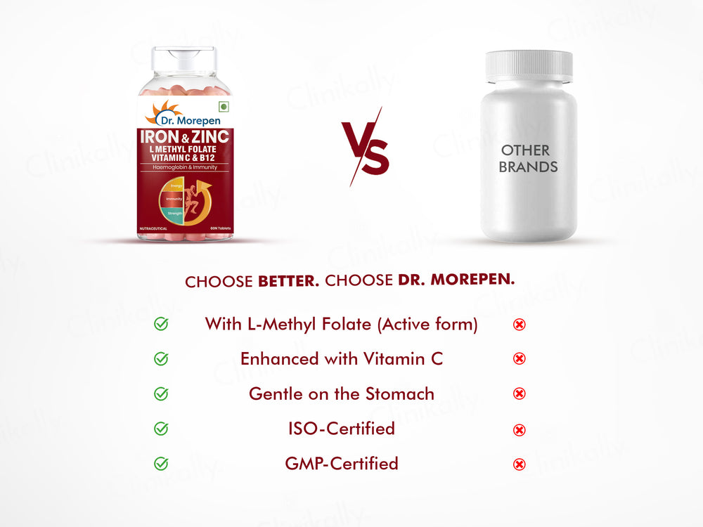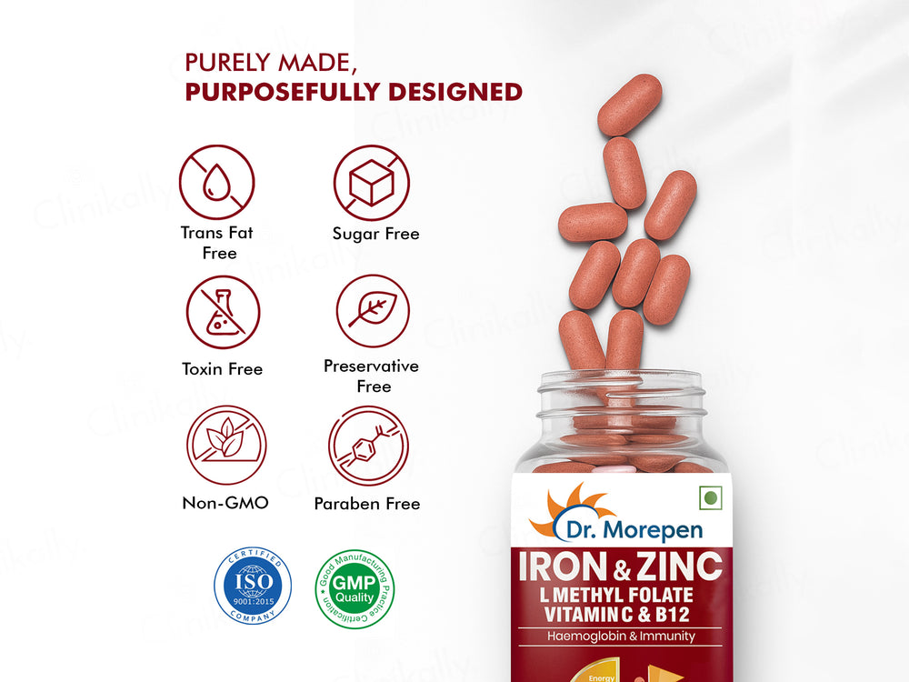 Dr. Morepen Iron & Zinc Tablets are meticulously formulated to address iron deficiencies and support overall health. Enriched with Iron, Zinc, Vitamin C, L-Methyl Folate, and Vitamin B12, these tablets work synergistically to enhance energy levels, bolster the immune system, and promote optimal hemoglobin production. Regular consumption aids in reducing fatigue, improving red blood cell count, and maintaining adequate iron reserves in the body.