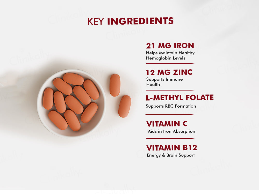The tablets contain Iron, Zinc, Vitamin C, L-Methyl Folate, and Vitamin B12.