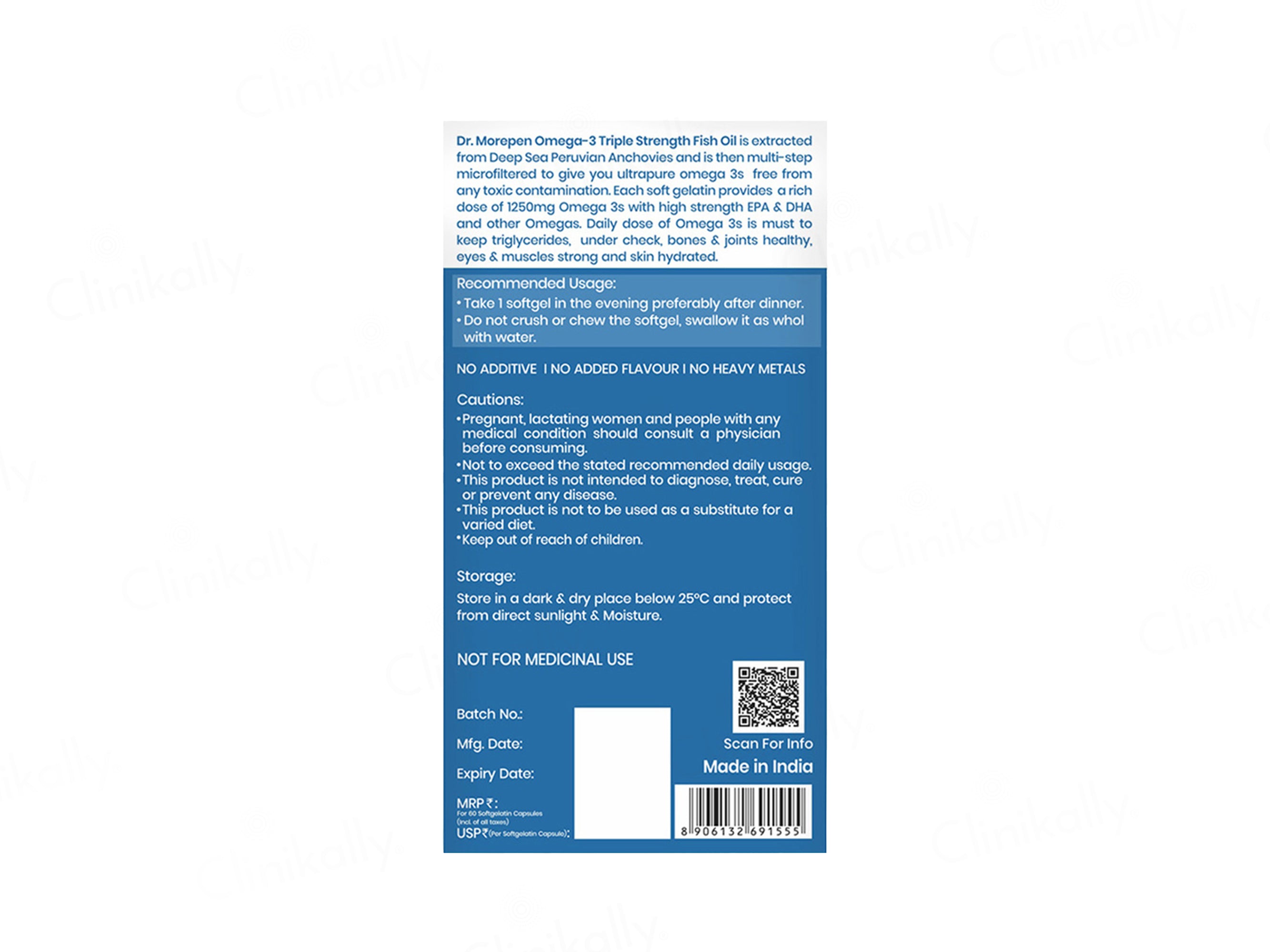 Dr. Morepen Omega-3 Deep Sea Fish Oil Triple Strength Soft Gelatin Capsule is a dietary supplement formulated to support heart, brain, eye, and joint health. Each softgel delivers 1250mg of deep-sea fish oil, providing 900mg of Omega-3 fatty acids, including 550mg of EPA and 350mg of DHA. Sourced from high-quality Peruvian anchovies, the fish oil undergoes molecular distillation to remove heavy metals and impurities, ensuring purity and safety.