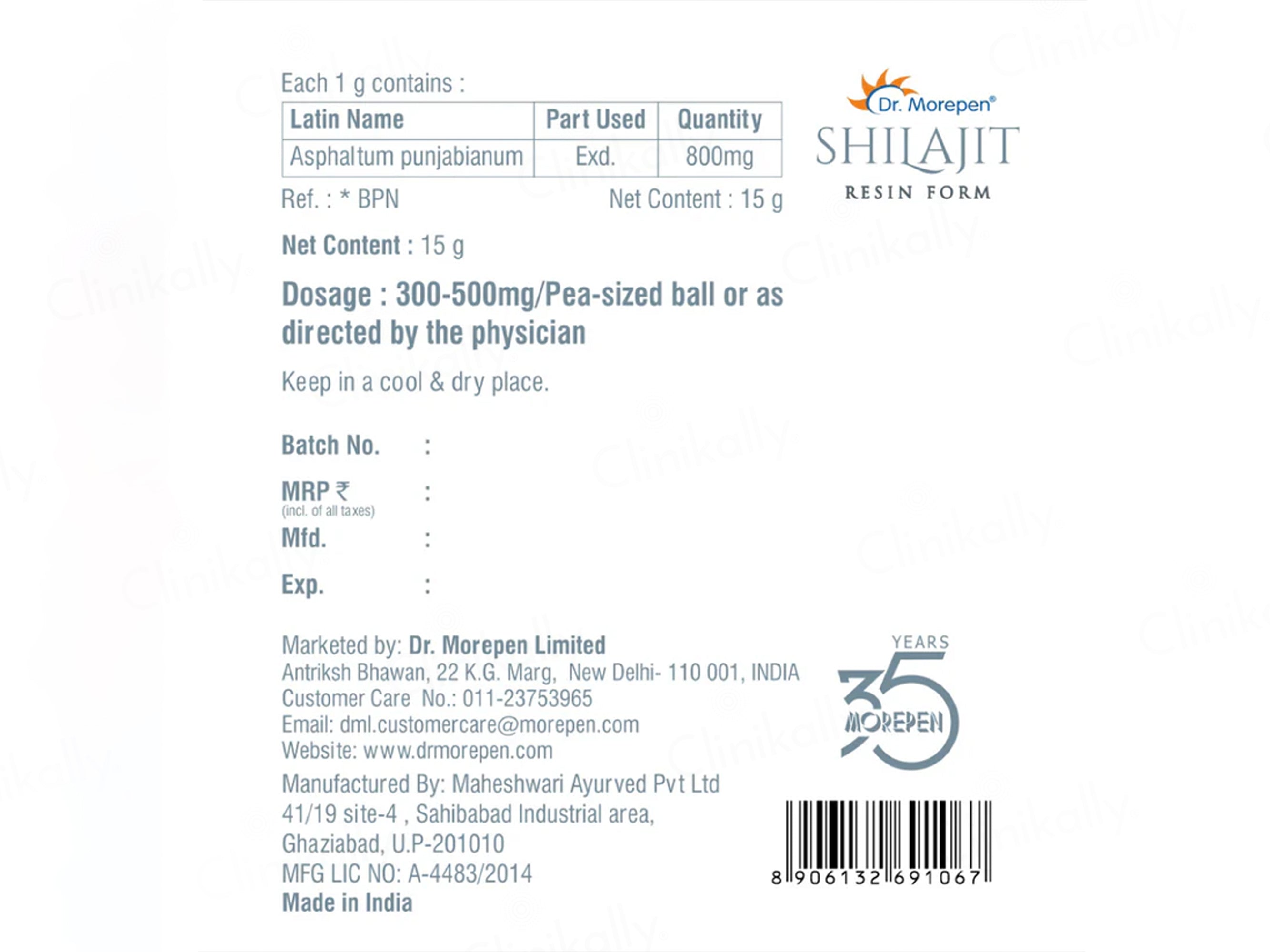Dr. Morepen Shilajit Pure And Natural Resin Form is a dietary supplement designed to enhance energy, stamina, and overall vitality with naturally sourced Shilajit resin, rich in fulvic acid and minerals. Enriched with antioxidants, it supports immune health, improves cognitive function, and promotes physical performance. This pure resin form, suitable for daily use for both men and women, delivers wellness benefits when used as directed.
