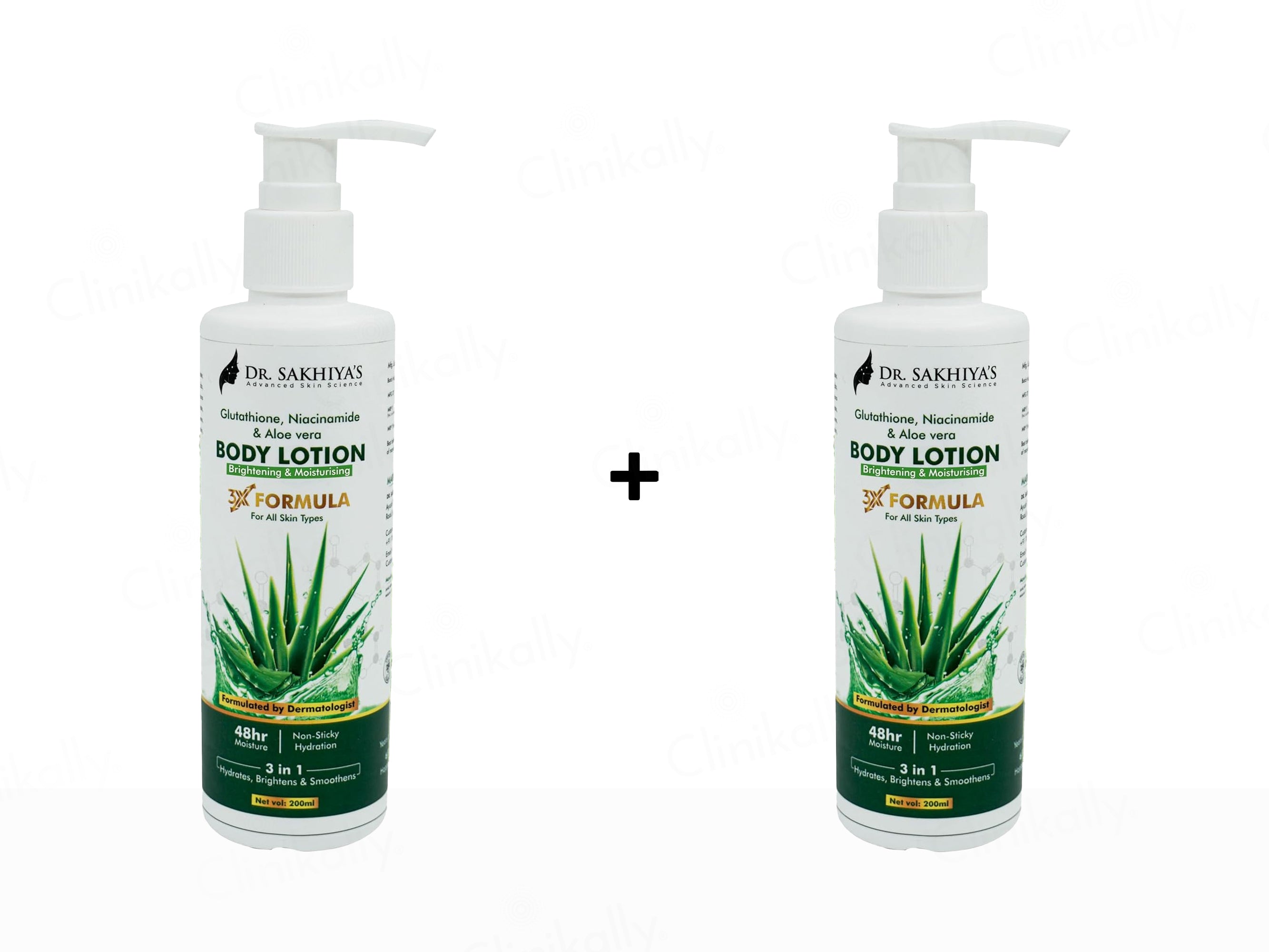 Dr. Sakhiya’s Aloe Vera Whitening & Moisturising Body Lotion is a dermatologist-formulated daily body care solution designed to deeply hydrate, brighten, and smooth the skin with its advanced 3X formula suitable for all skin types, powered by Aloe Vera to soothe and lock in long-lasting moisture, Glutathione to support skin brightening and help reduce dullness, and Niacinamide to improve uneven tone and enhance skin clarity, further enriched with Vitamin E Acetate to provide antioxidant protection and support skin repair, combined with Glycerin for intense hydration and softness, delivering up to 48-hour moisturization with a lightweight, non-sticky texture that absorbs quickly without greasiness, helping skin feel refreshed, nourished, and visibly healthier with regular use.