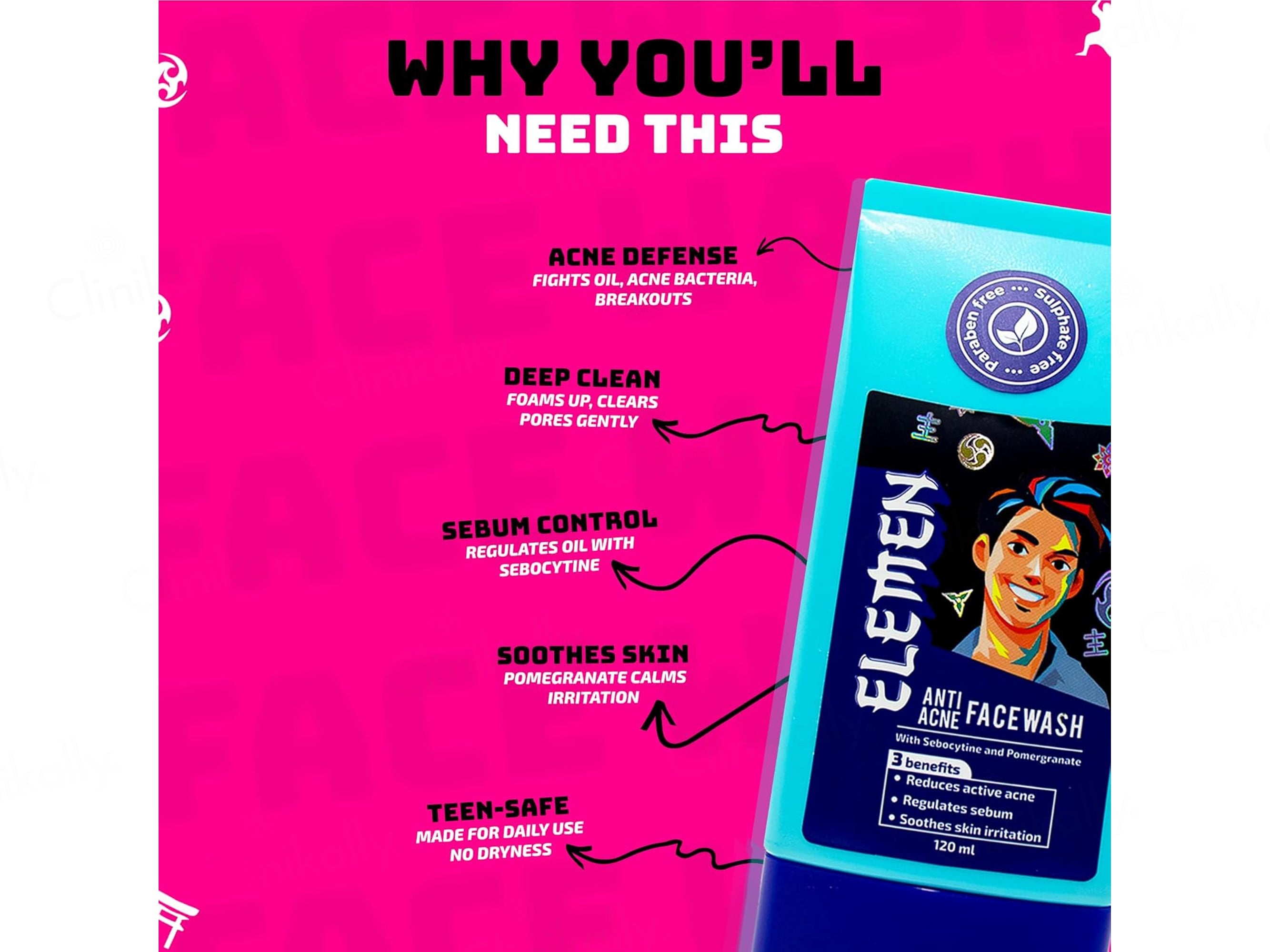 Elemen Anti Acne Face Wash is a gentle, sulphate-free and paraben-free cleanser formulated to combat acne while regulating sebum production and soothing skin irritation, delivering clean and breakout-free skin without stripping moisture. Infused with Sebocytine (Rosa Canina Fruit Extract) for oil control and Pomegranate (Punica Granatum Pericarp Extract) for antioxidant protection, along with key ingredients like Acetamidoethoxyethanol, Decyl Glucoside, Dehydroxanthan Gum, Glycerin, Cocamidopropyl Betaine, Lactic Acid, Maltodextrin, Phenoxyethanol, Triethylene Glycol, Sodium Cocoyl Isethionate, and Butylene Glycol, it effectively reduces active acne and maintains skin balance.