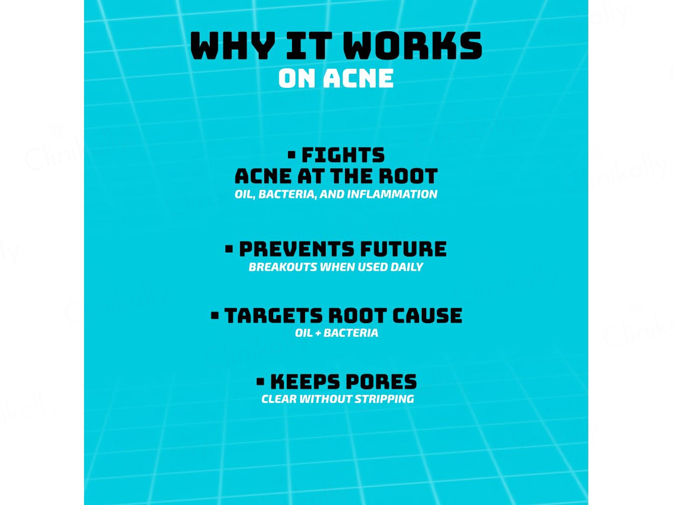 - Clears dirt, oil & acne bacteria gently.