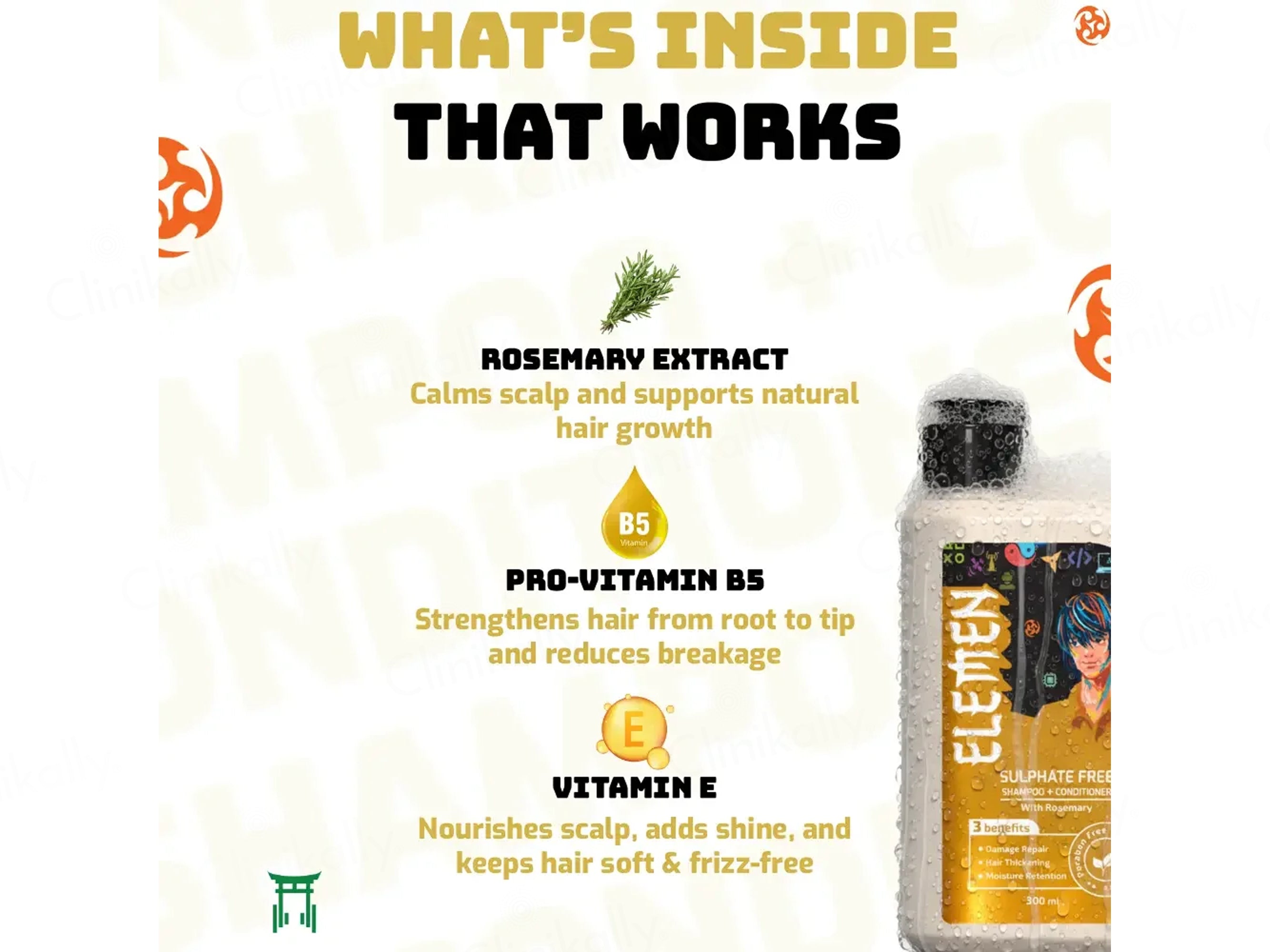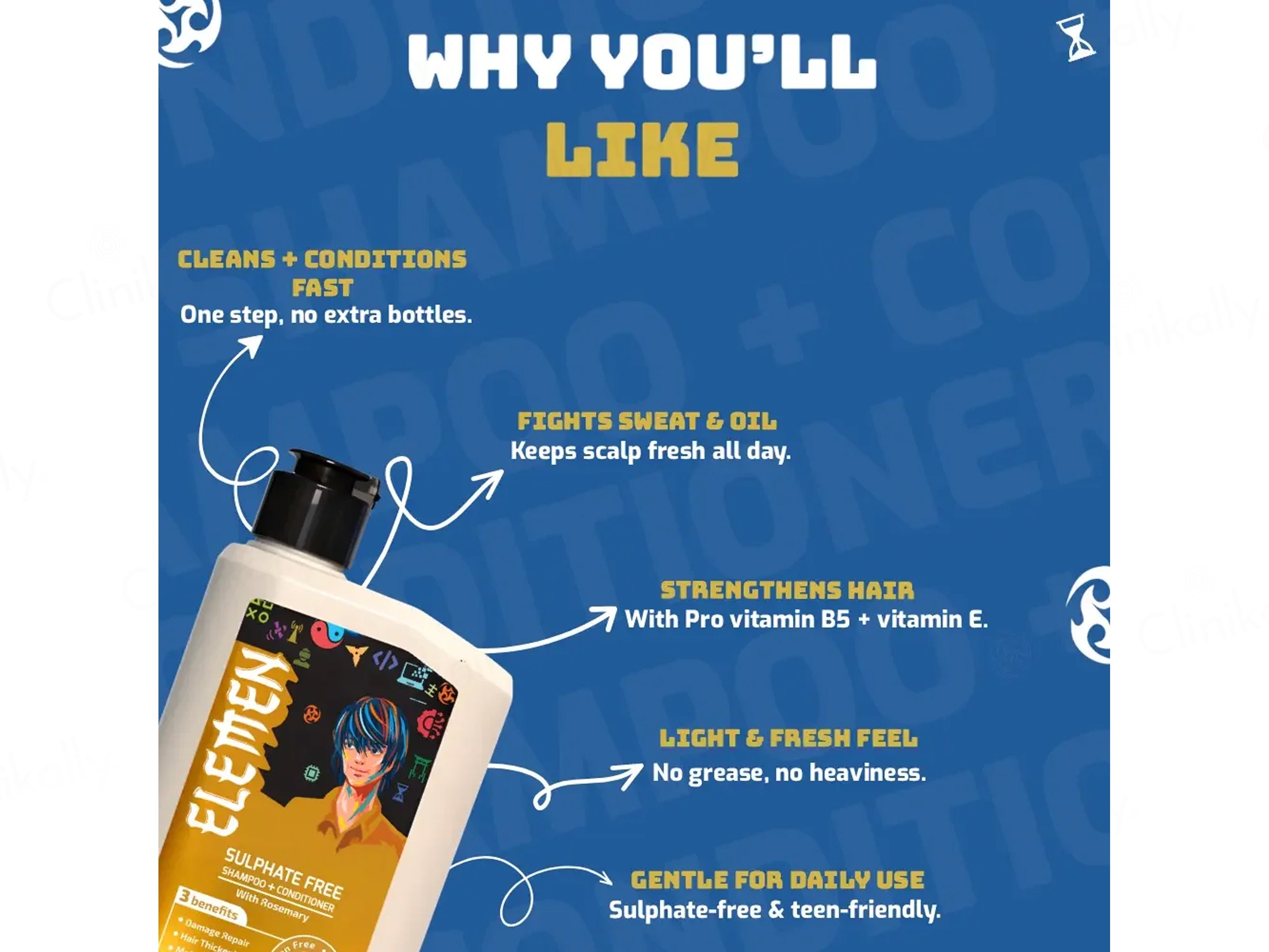 Elemen Sulphate Free Shampoo + Conditioner With Rosemary is a gentle 2-in-1 tube formula designed for daily use, especially suited for kids and teenage boys 11+ years, providing effective cleansing and conditioning in one wash while being sulphate-free to preserve natural moisture and suit sensitive scalps, color-treated hair, and active lifestyles. Infused with key natural and nourishing elements like Rosemary Essential Oil (or Extract) for scalp calming, stimulation of healthy growth, and flake control, Pro-Vitamin B5 (Panthenol) for deep hydration, strengthening strands, and reducing hair fall, and Vitamin E for antioxidant protection and nourishment from root to tip, this product deeply cleanses the scalp, fights sweat and oil buildup, leaves hair soft, fresh, smooth, and flake-free, while promoting stronger, healthier strands with improved texture and shine.