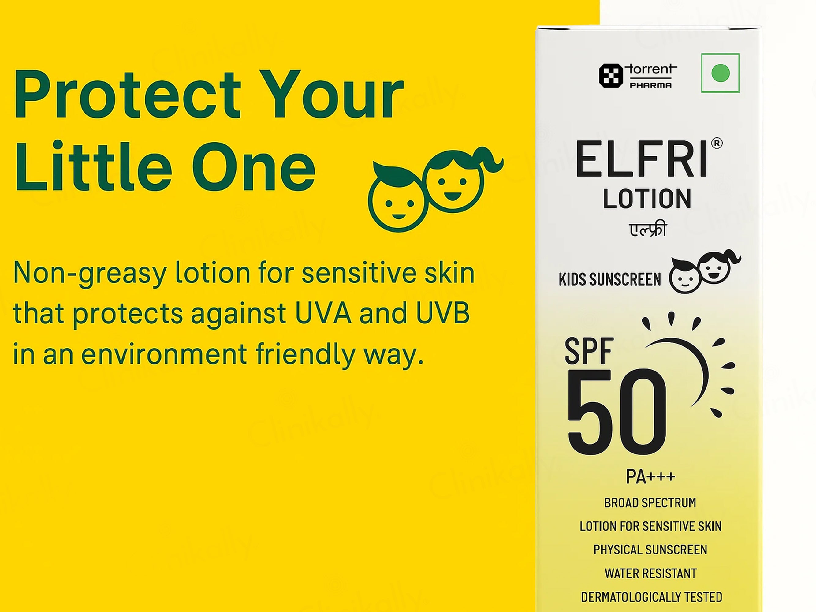 Elfri Kids Sunscreen Lotion SPF 50 PA+++ is a dermatologically tested physical mineral sunscreen with Zinc Oxide for broad-spectrum protection, hydration, and 40-minute water resistance tailored for children's sensitive skin.