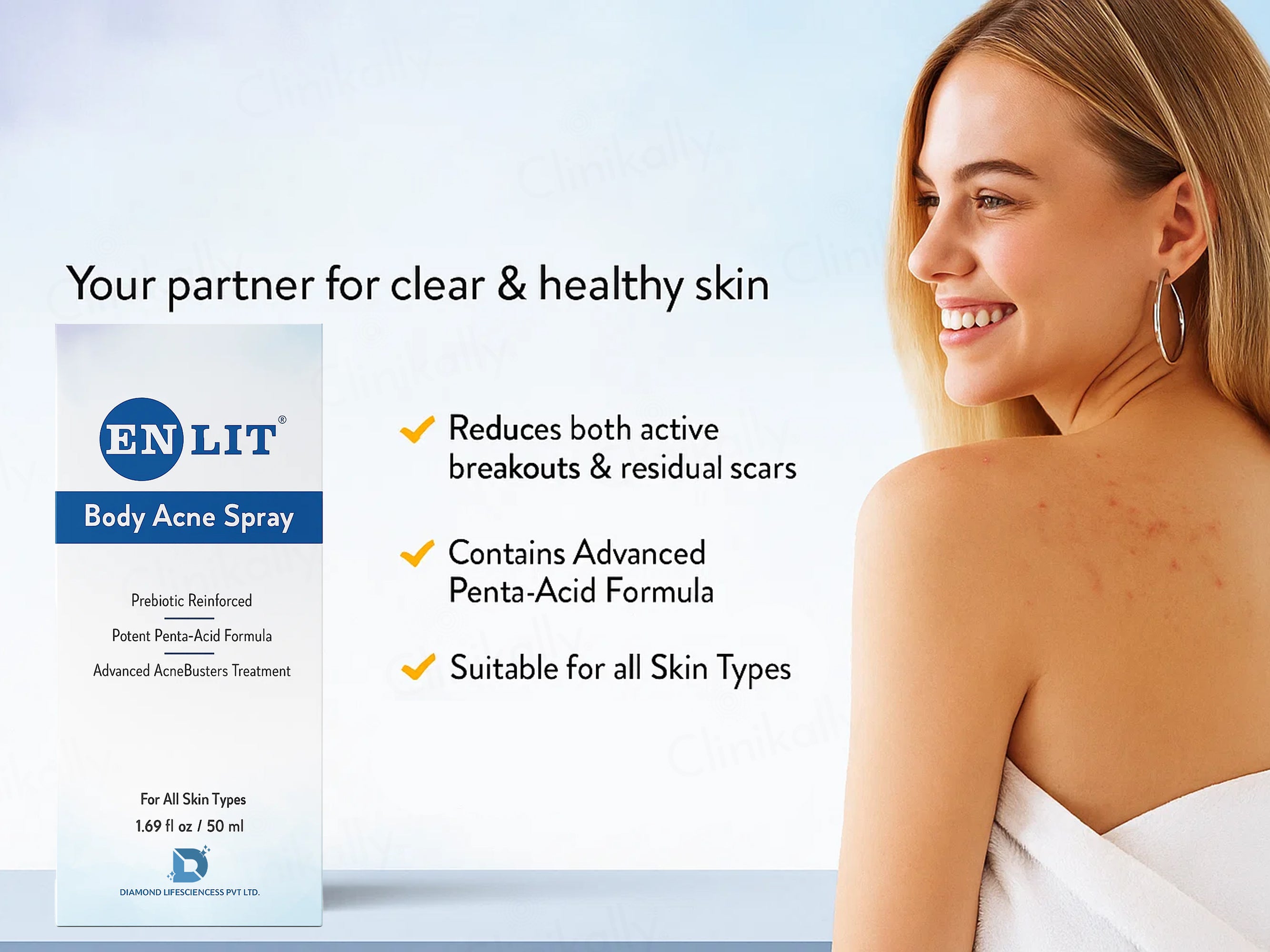 Enlit Prebiotic Body Acne Spray is a spray with Salicylic Acid to treat and control body acne.