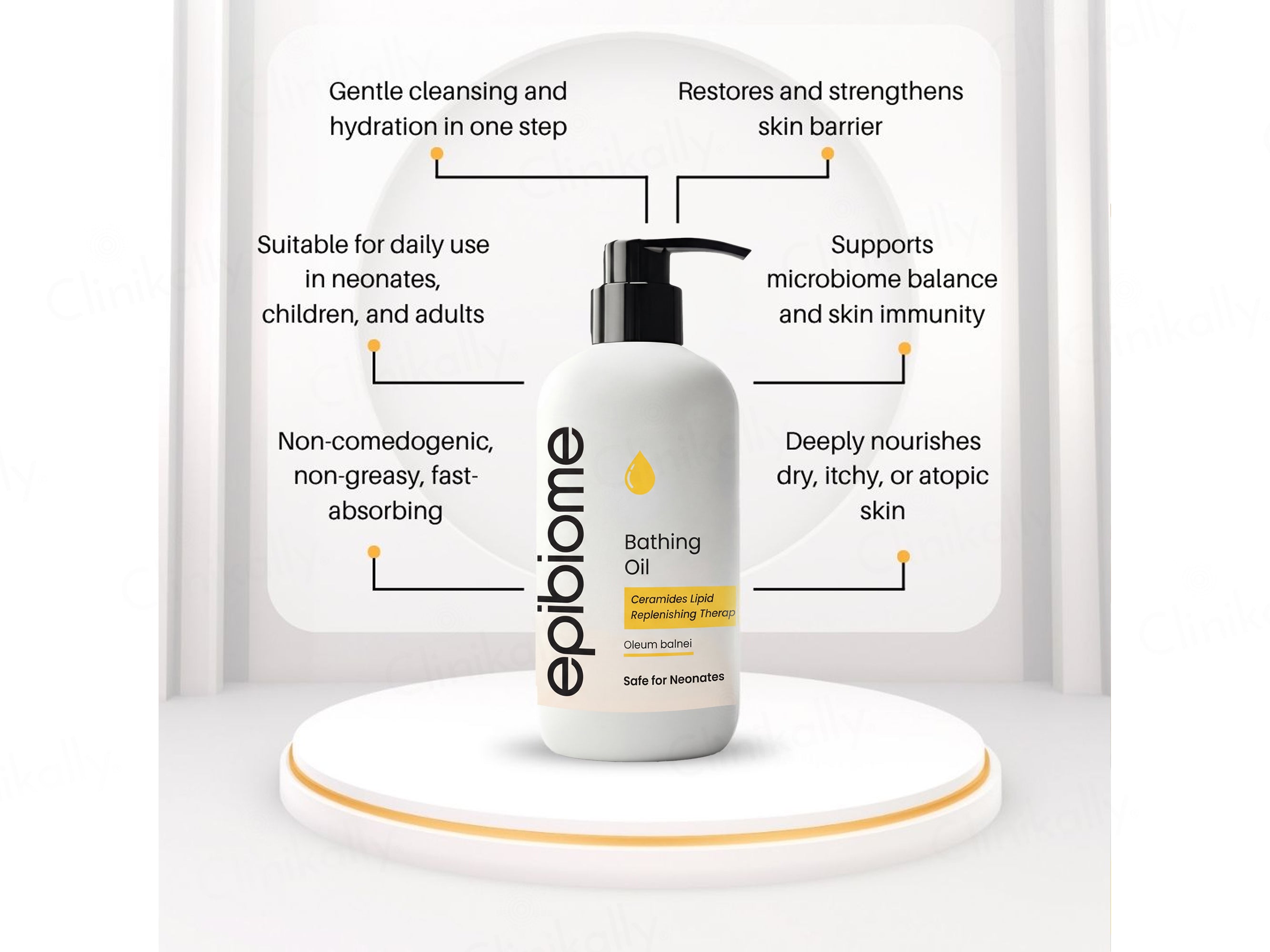 - Bath Method: Add 1–2 capfuls of Epibiome Gentle Bathing Oil to lukewarm bathwater, mix well, bathe for 5–10 minutes, then pat dry gently.