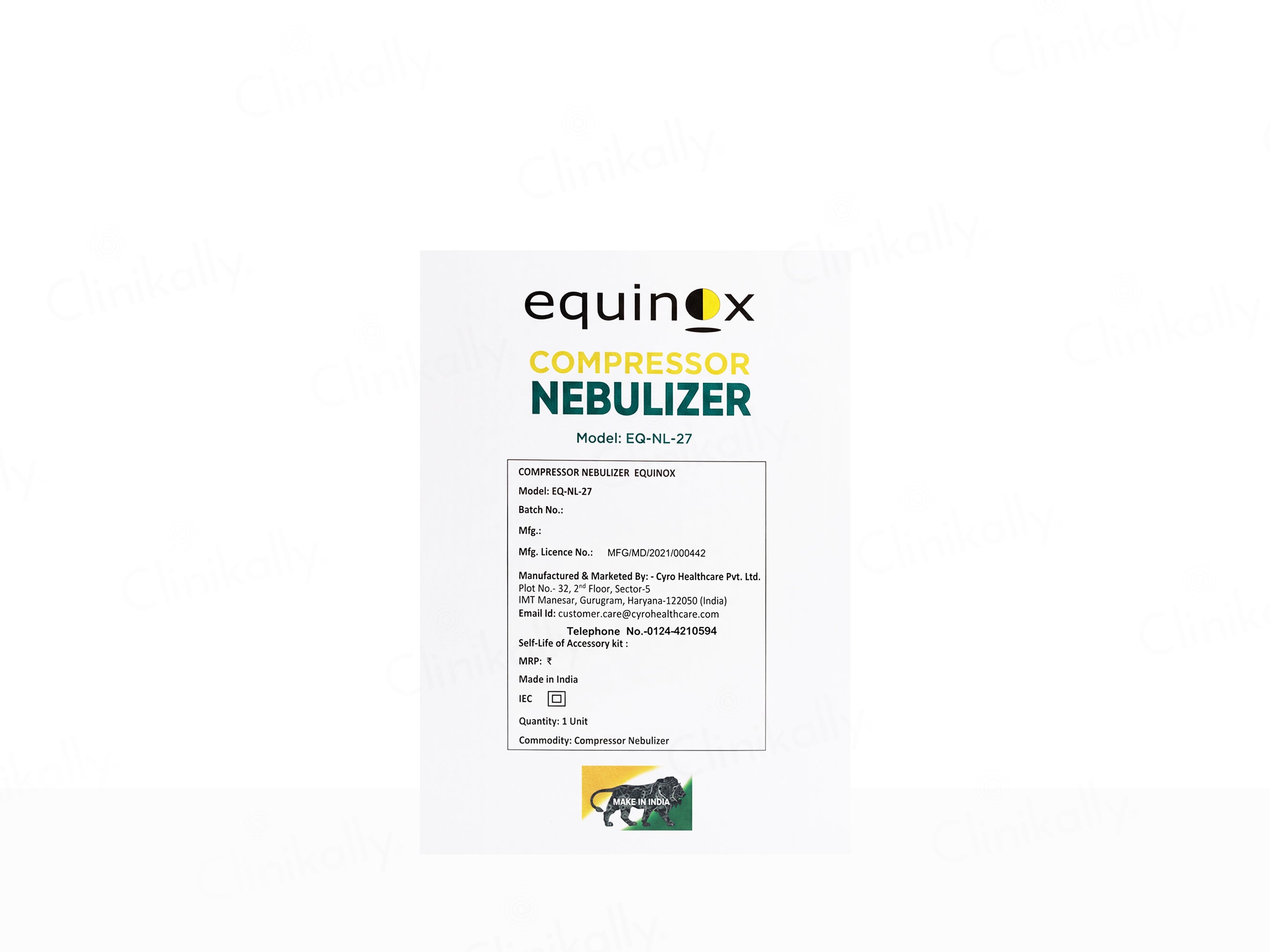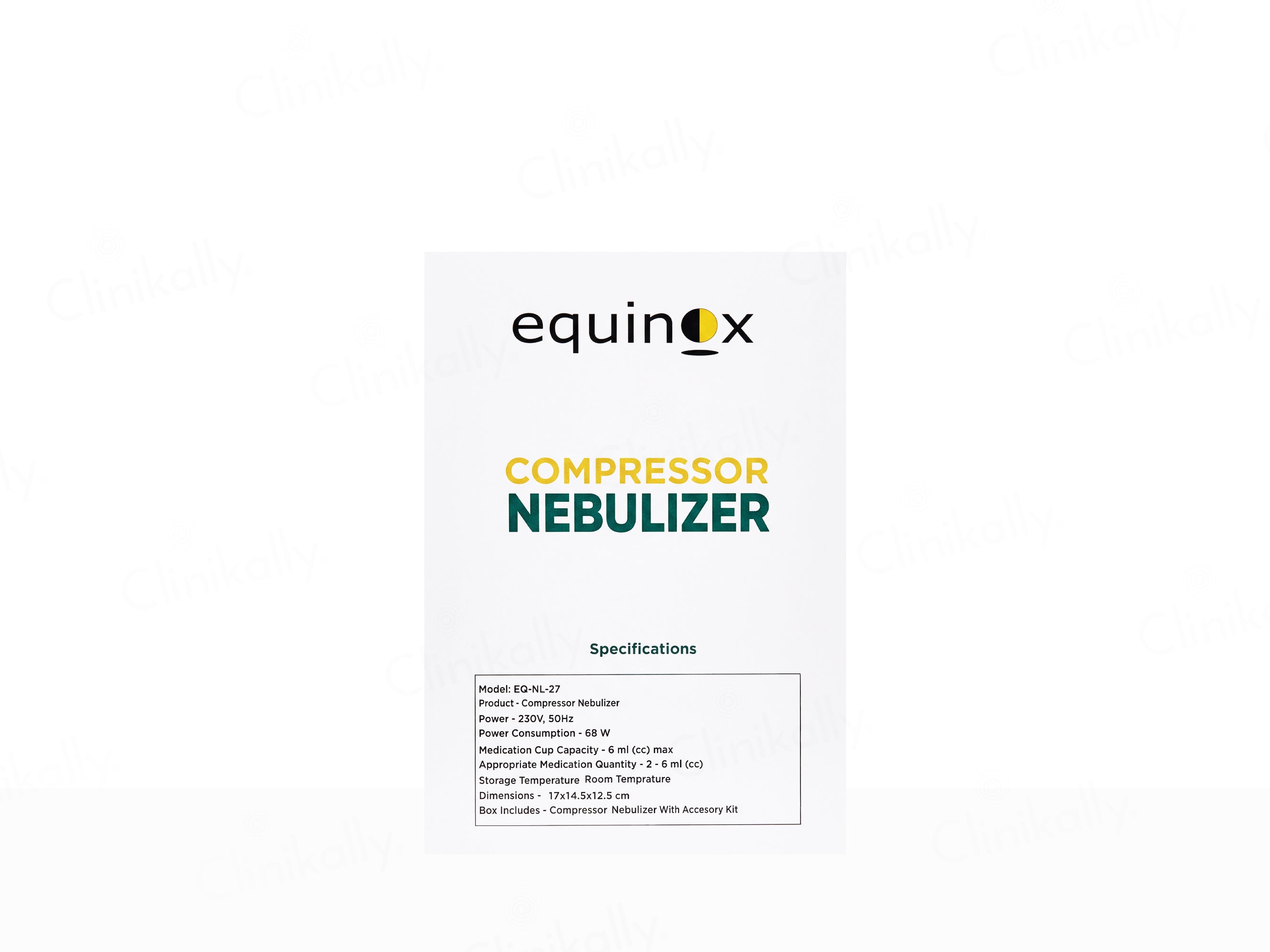 Equinox EQ-NL-27 Compressor Nebulizer dimensions are listed as approximately 17 × 14.5 × 12.5 cm.