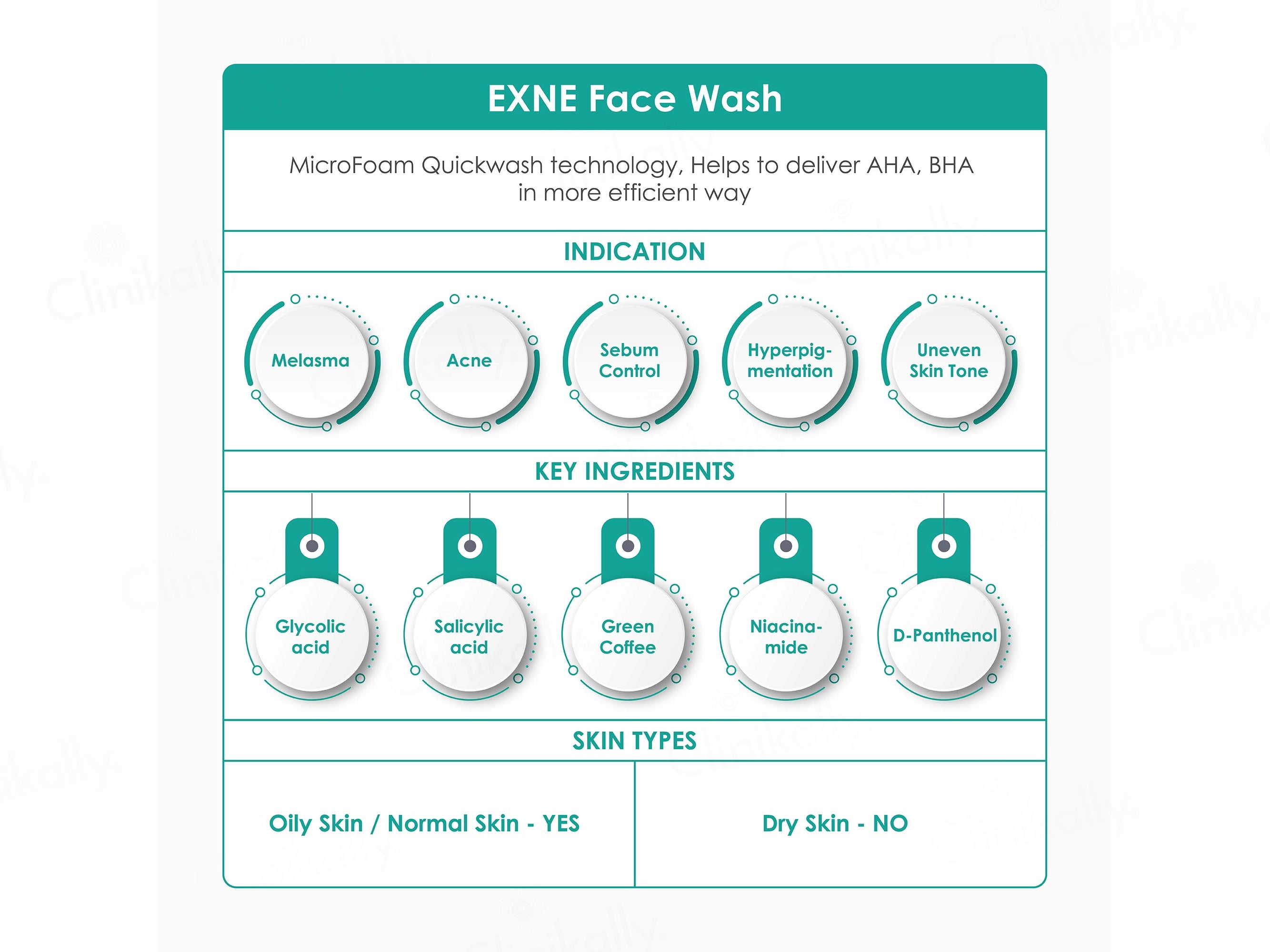 Exne Gentle Exfoliating & Moisturising Daily Face Wash is a gentle yet effective daily cleanser designed to exfoliate, brighten, and hydrate the skin while maintaining its natural moisture barrier, making it suitable for all skin types including sensitive, oily, acne-prone, and dull skin; powered by MicroFoam Quick Rinse technology for a luxurious, quick-lathering foam that deeply cleanses without stripping, it helps remove impurities, control excess oil, reduce blemishes, promote a radiant glow, and leave the skin feeling soft, smooth, and refreshed. Key ingredients include D-Panthenol (pro-vitamin B5) for intense hydration and soothing, Glycolic acid and Citric acid for gentle chemical exfoliation to unclog pores and improve texture, Willow Bark Extract as a natural source of salicin for mild exfoliation and anti-inflammatory benefits, Niacinamide to regulate oil, minimize pores, brighten complexion, and strengthen skin barrier, and Coffee Arabica Extract for antioxidant protection, energizing the skin, and boosting glow.